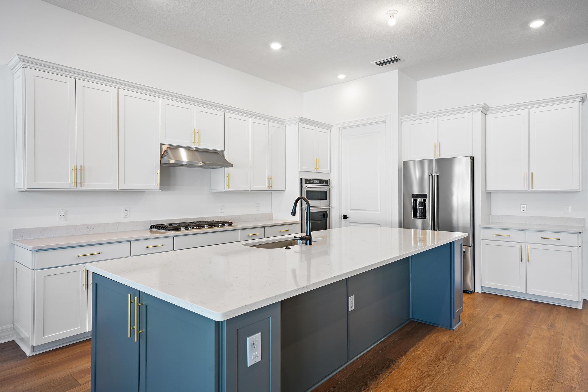 The kitchen is both elevated and functional, showcasing upgraded cabinetry, 1.2" quartz countertops, pendant pre-wiring, and a layout designed for gathering. Technology and convenience are thoughtfully integrated with a Smart Home low-voltage package, wireless access points, a 16-port network switch, flat-panel TV prep with LAN wiring in all bedrooms and gathering areas, and custom TV mounts.