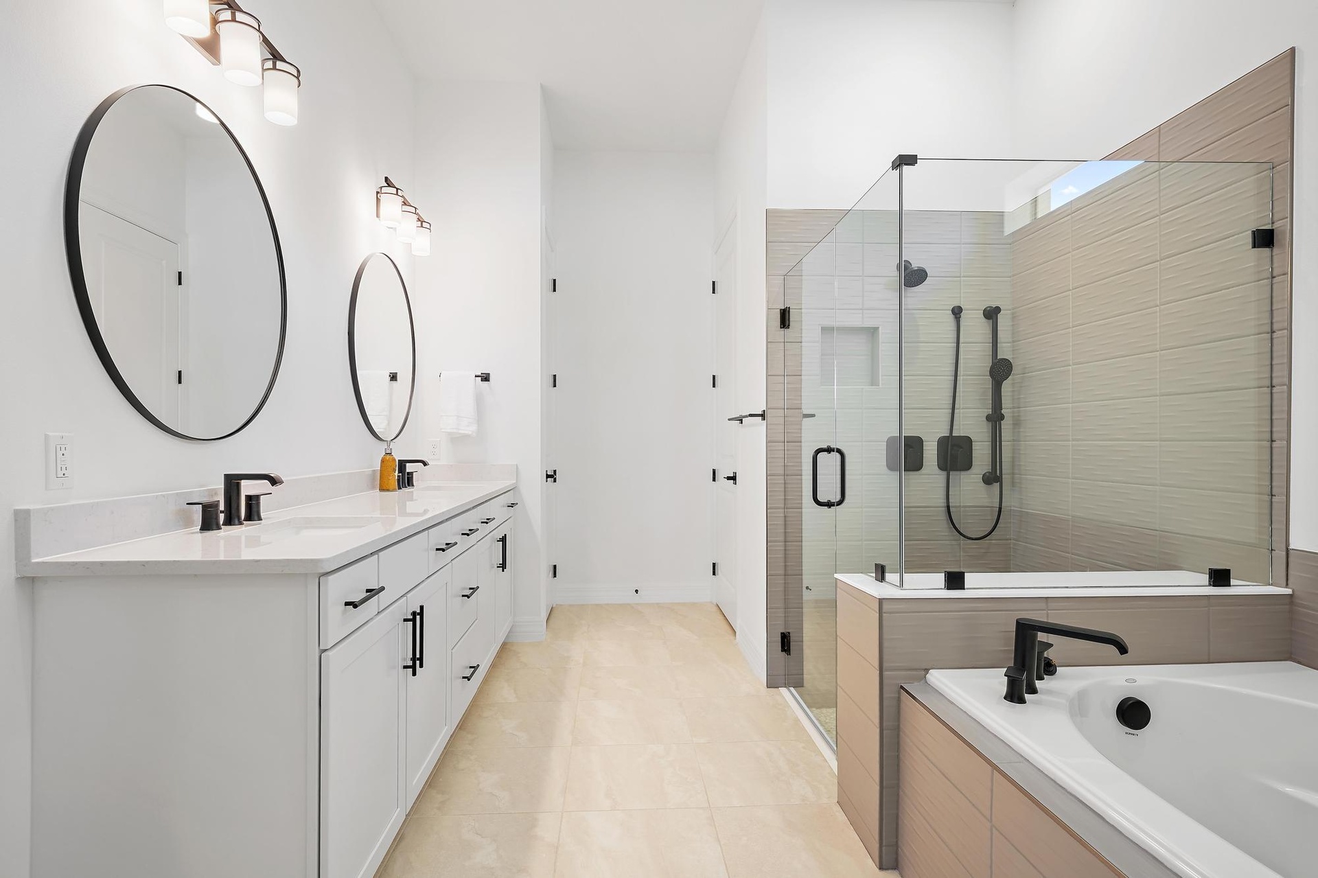Each bath has been tastefully enhanced. The owner's suite features a spa-inspired bath with a walk-in shower and soaking tub, heavy frameless glass enclosure, dual shower heads, upgraded countertops, fixtures, and custom mirrors. Secondary baths also offer walk-in showers with frameless glass, upgraded finishes, and custom detailing. A dedicated lanai bath with walk-in shower adds convenience for poolside entertaining.