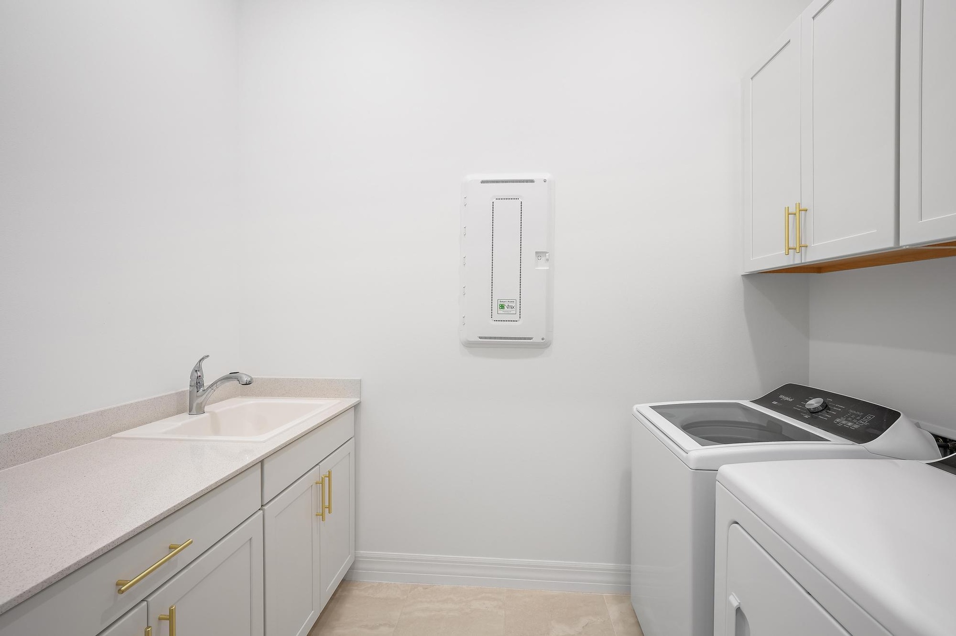 Additional upgrades include an advanced HVAC air quality system with Carbon Clean MERV 16 filter, UVA light, and catalyst, a full laundry room with upgraded cabinetry and sink, a complete security system with three wired outdoor cameras and integrated video doorbell, and a meticulously finished garage with custom epoxy flooring, additional lighting, keyless entry, GFI circuit, sink, and LED enhancements.
