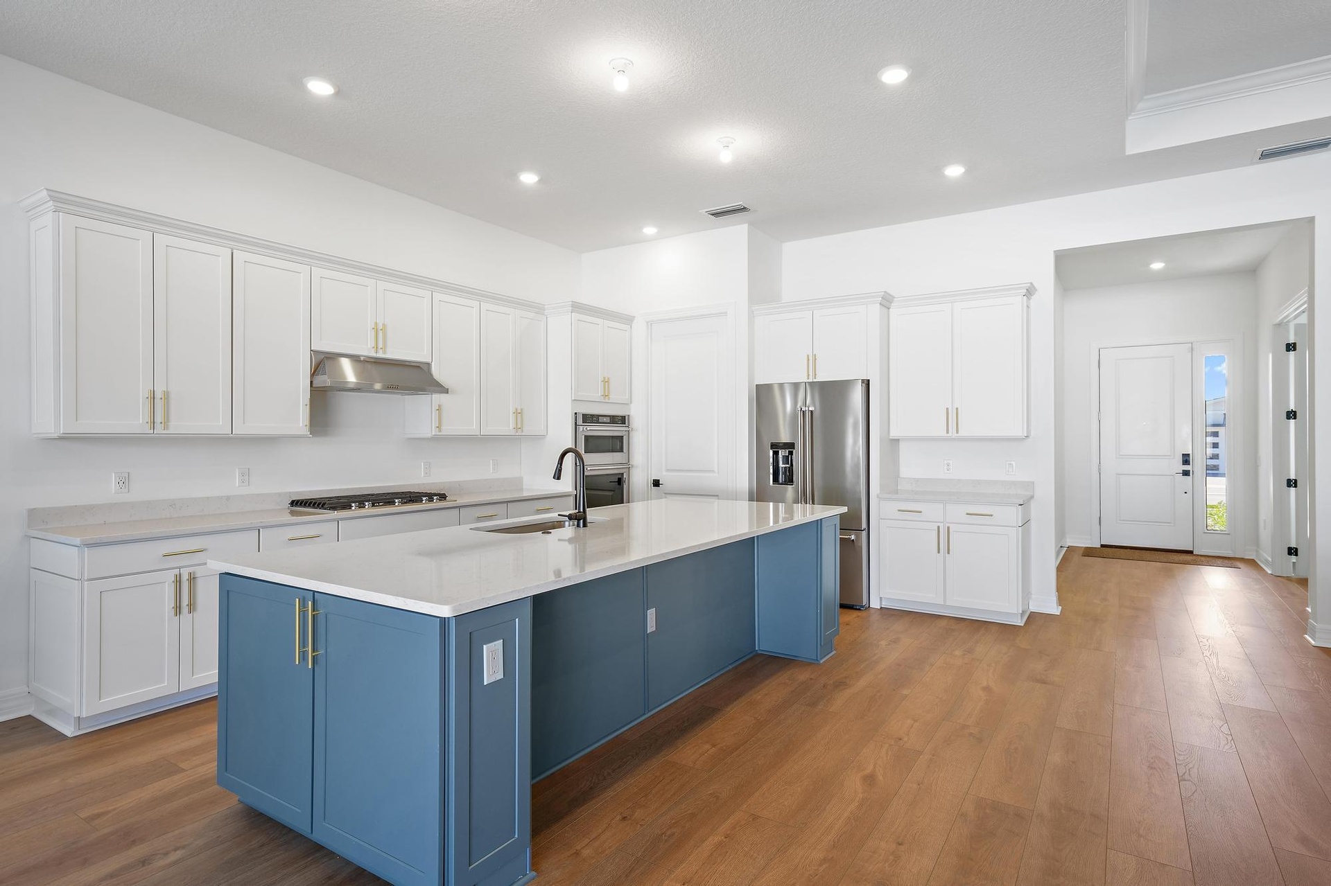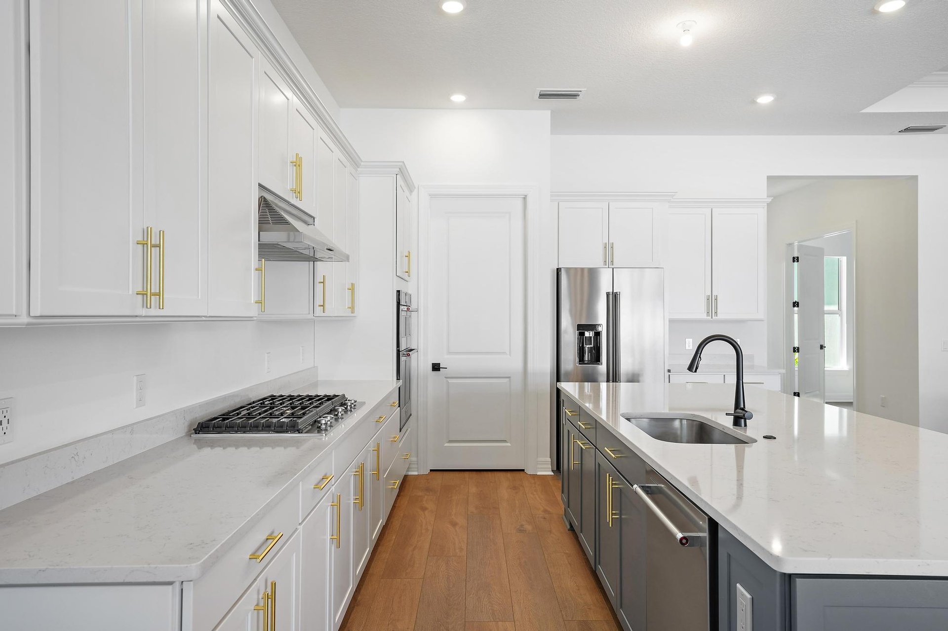 Set within the sought-after Avondale neighborhood of Avenir in Palm Beach Gardens, this exceptional Stellar model from the Estate Collection blends modern design, thoughtful upgrades, and effortless indoor-outdoor living. Offering 3 bedrooms, 4 full baths, and 2,523 square feet, this beautifully enhanced residence is positioned on a .23-acre estate lot with a desirable coastal exterior and a true three-car garage featuring a rare 4-foot extension. From the moment you enter, the home's light-filled layout and refined finishes make an immediate impression. A dramatic zero-corner sliding glass door in the gathering room creates seamless connectivity to the lanai, blurring the lines between interior and exterior living. Luxury vinyl plank flooring flows throughout all living areas, complemented by upgraded LED lighting and a curated four-light downlight package in the gathering room and owner's suite.