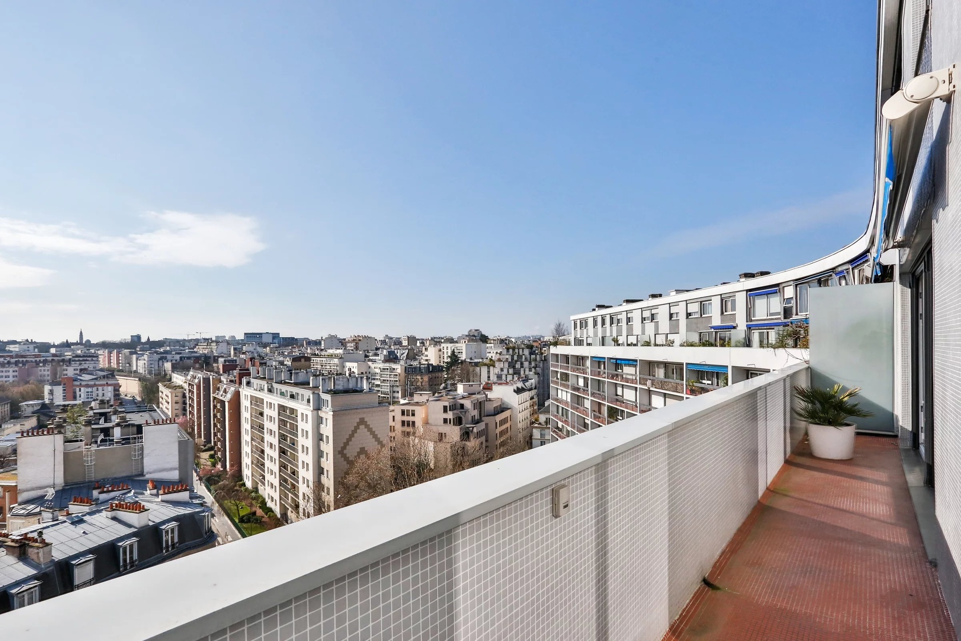 MERIDIEN - Rue Émile Dubois, Paris 14th On the top floor in duplex (12th and 13th) with elevator, within a very high-standard building with a caretaker, a 4-room apartment of 95m2 consisting of: an entrance, a light-filled living room opening onto a large 10m2 balcony with panoramic views over the rooftops of Paris, an independent kitchen (possible to open), a separate WC. Upstairs: 3 quiet bedrooms, 1 shower room, 1 bathroom, and a separate WC. Apartment in good general condition, filled with light, and functional. A cellar complements this property. 3 parking spaces are sold separately for 45,000 euros.