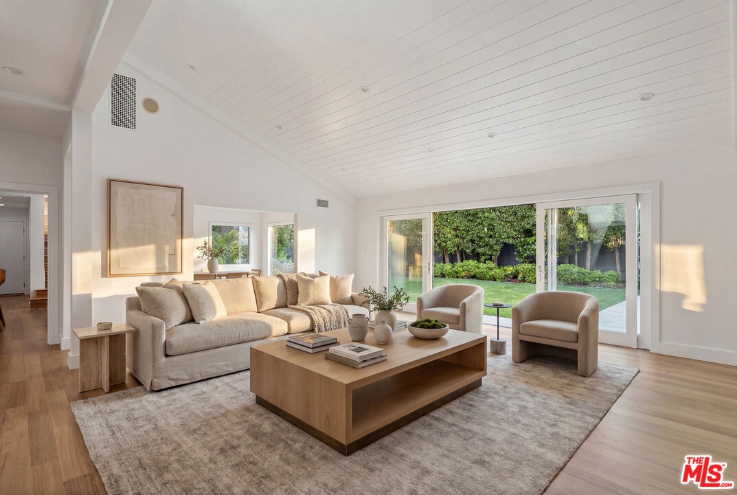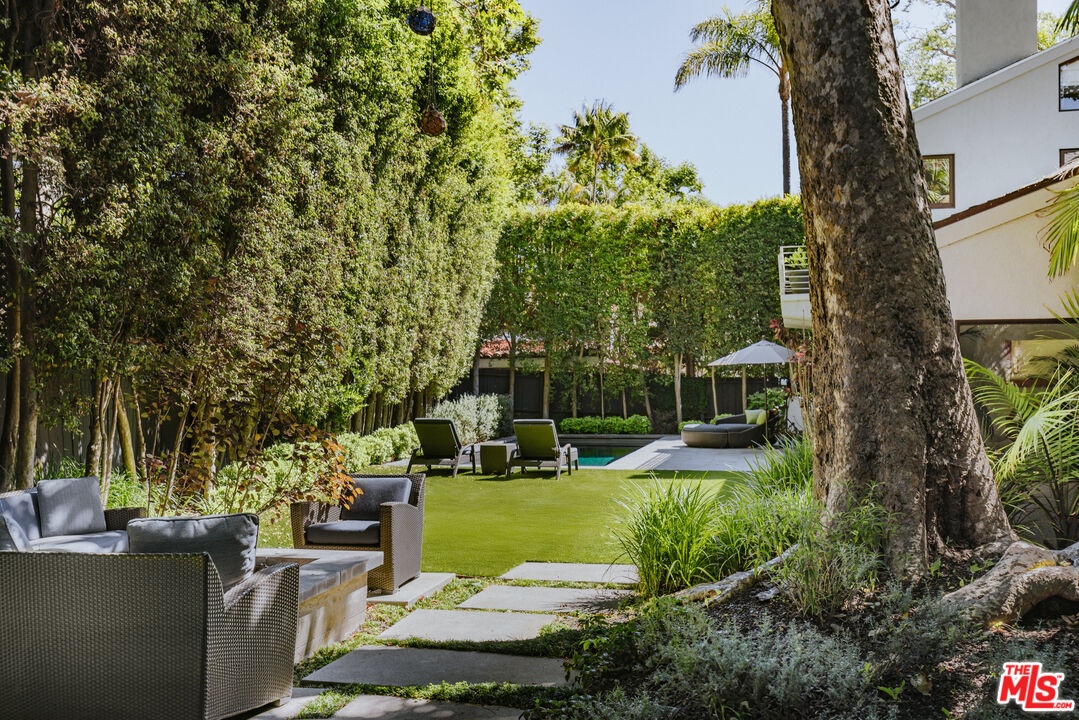 Located on a quiet cul-de-sac in one of the most peaceful pockets of Santa Monica Canyon, this recently renovated contemporary home offers privacy, scale, and effortless indoor-outdoor living on an expansive, flat lot. Set behind gates and surrounded by mature trees, the property feels both secluded and connected to the best of canyon living. The home is filled with natural light, featuring soaring ceilings, walls of glass, and an open, flowing floor plan designed for both everyday living and entertaining. A dramatic entry with a statement staircase leads to spacious living and dining areas, a dedicated office or den, and a chef's kitchen with custom cabinetry and high-end appliances. The kitchen opens seamlessly to the family room, all overlooking the beautifully landscaped backyard. Outdoor spaces are designed for year-round enjoyment, complete with multiple entertaining patios, a fire pit, built-in BBQ, and a pool and spa - all framed by lush greenery for added privacy. Upstairs, the primary suite offers a private retreat with a sitting area, fireplace, dual walk-in closets, and a spa-like bath, along with access to outdoor terraces. Five additional bedrooms and well-appointed living spaces provide flexibility for guests, family, or work-from-home needs. Additional highlights include hardwood floors, French and sliding doors throughout, two staircases, and a direct-access two-car garage. Just moments from the beach, this turnkey property combines the tranquility of canyon living with close proximity to everything the Westside has to offer, all within a close-knit and highly sought-after community.