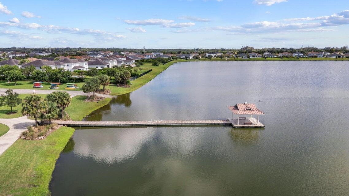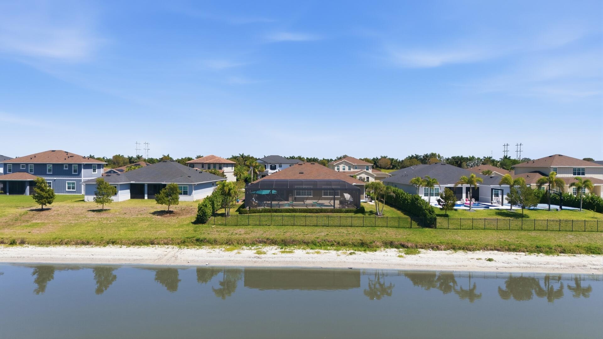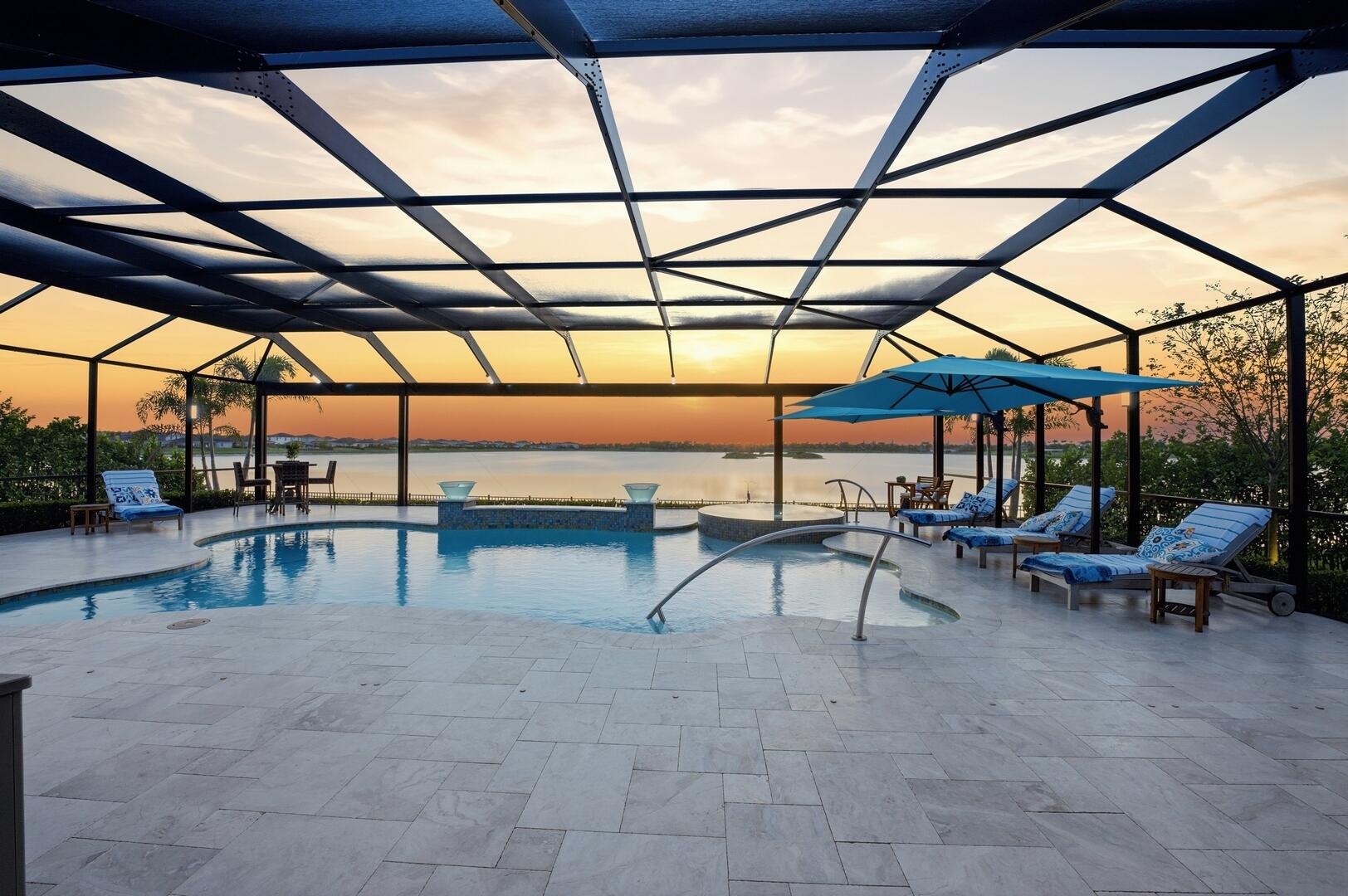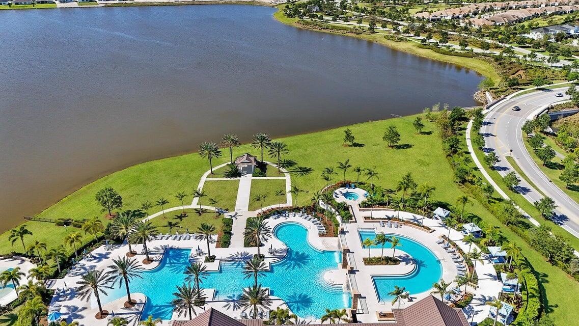 A stunning lakefront pool home designed with a clean, modern edge and elevated finishes throughout. Offering 4 bedrooms plus a sleek study/den and 3.5 baths, the home makes an immediate statement with a dramatic double-door entrance that opens into a grand foyer featuring a striking triple tray ceiling. The main living space is wide open and filled with natural light, anchored by a spacious great room with walls of glass that fully connect indoor and outdoor living. Entertain effortlessly in the formal dining area, all wrapped in smooth walls, crown molding, wood-look plank tile flooring, impact windows, and plantation shutters. You also have the peace of mind of a whole-house generator and a full water purification system already in place. The kitchen is straight out of a design magazine—crisp, modern, and highly functional. Quartz countertops, a clean tiled backsplash, stainless steel appliances, a 5-burner gas range with vented hood, oversized island, and casual breakfast nook all come together in a space that's built to impress. The primary suite is a private escape with a tray ceiling, dual walk-in closets, and a spa-style bath featuring a freestanding soaking tub and a glass-enclosed walk-in shower. Outside is where this home really separates itself—your own resort-style setting overlooking the water. A custom saltwater heated pool and spa with 6 jets, marble decking, full screen enclosure, and a fully equipped summer kitchen with top-of-the-line appliances create a seamless outdoor lifestyle that feels like a private retreat. Finished off with Polyaspartic garage flooring and a premium lakefront setting, this home is dialed in, move-in ready, and built for the way people want to live today. Located within walking distance to the new elementary school and near top-rated K-12 options, this home offers convenience as well as luxury. The community provides resort-style amenities: miles of trails, two clubhouses, pools, pickleball, tennis, basketball, boat ramp, fishing piers, skate park, dog parks, and even a working farm offering organic produce to residents.