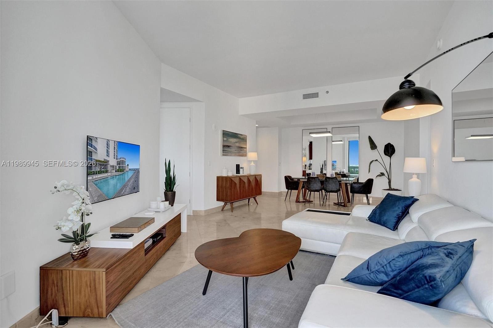 Experience oceanfront luxury in this fully furnished 2-bedroom, 2-bathroom residence at Trump Tower I. Located on the 8th floor, this elegant home offers beautiful Intracoastal views, private elevator entry, marble floors, and floor-to-ceiling windows that fill the space with natural light. The open-concept layout features a gourmet kitchen with wood cabinetry and stainless steel appliances, flowing seamlessly into the living and dining areas. A spacious balcony provides the perfect setting for relaxing or entertaining.