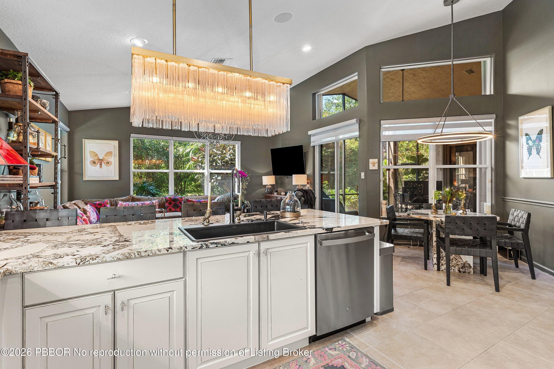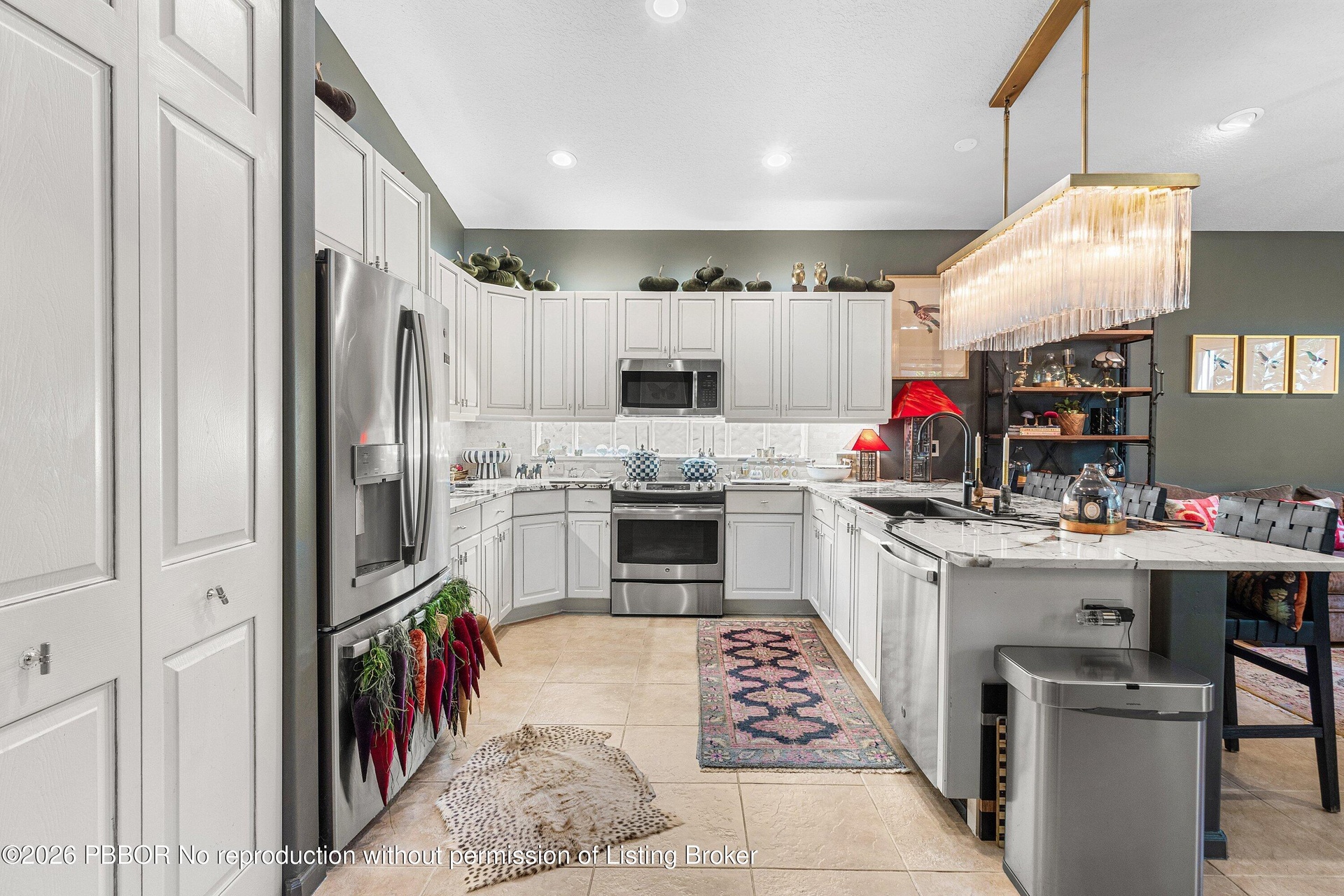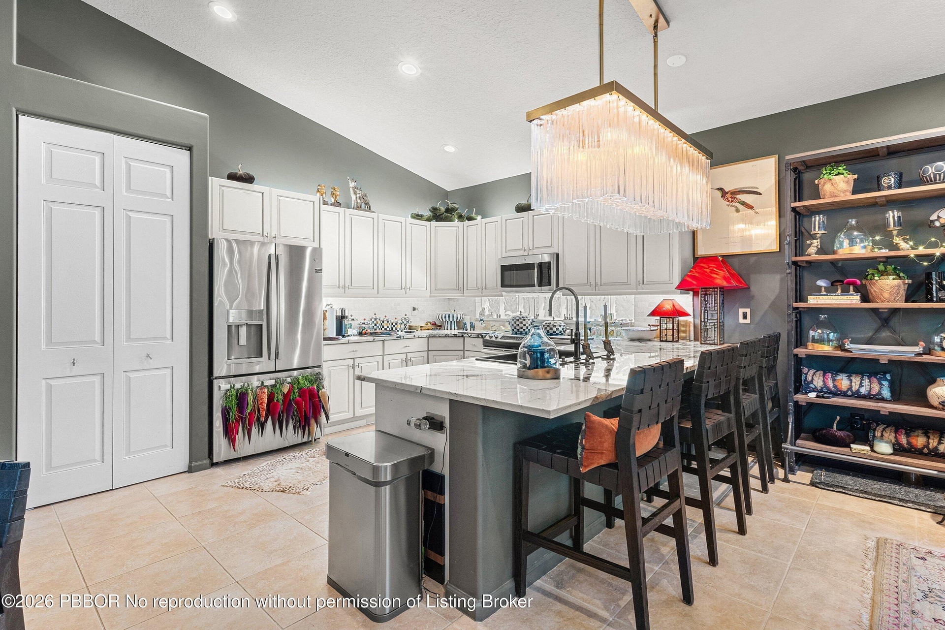 The updated kitchen showcases quartzite counters, marble backsplash, Kohler sink with Graff faucet, stainless steel appliances, custom lighting, and breakfast bar seating. Soaring