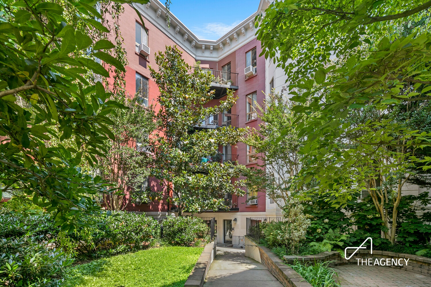 The flexible living and dining area offers plenty of space for both comfortable everyday living and effortless entertaining. The open kitchen blends seamlessly into the living space and is equipped with an oversized breakfast bar and stainless steel appliances. Just beyond the living room, a shared balcony provides a peaceful outdoor extension of the home, overlooking the building's beautifully landscaped private garden.