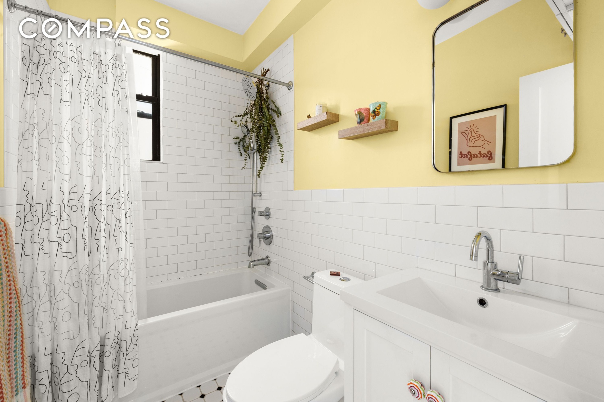 This pristine pre-war co-op offers a versatile layout, charm, and convenience. Legally a 2-bedroom, this sunny unit is currently configured as a 1-bedroom with a separate, enclosed living room and a spacious dining room. Enter the versatile open-plan living/dining room and fully updated kitchen with new stainless steel appliances (including a Bosch dishwasher), quartz countertops, abundant crisp white cabinetry, and a breakfast bar. The king-size primary bedroom, replete with a pair of oversized windows, built-in bookshelves, a charming ornamental marble fireplace and mantel, a ceiling fan, and two closets, is utilized as a comfortable living room. There is a roomy secondary bedroom with a window and closet, as well. At the opposite end of the apartment are a renovated bath with a soaking tub and a washer/dryer. There are hardwood floors, tall ceilings, and overhead storage that reaches the ceiling in each room. A dedicated storage area is also available in the basement.