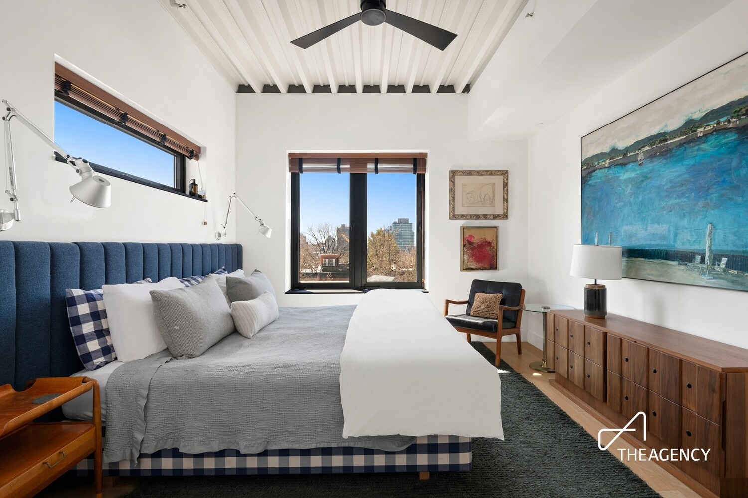 Accessed by a private elevator entrance, this sun filled home opens into a striking great room where soaring ceilings, floor to ceiling windows, and subtle industrial elements create a bright and inviting atmosphere. The open-concept chef's kitchen blends style and functionality, featuring high end stainless steel appliances, sleek stone countertops, and a generous Carrera marble island that serves as a natural gathering point for dining, working, or hosting.