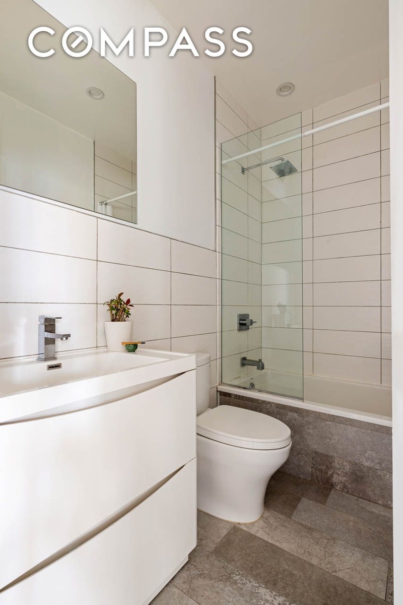 Both bedrooms are positioned at the rear of the home, offering privacy from the street. The primary bedroom fits a king-sized bed with space for additional furniture and includes a spacious closet and an en-suite bath finished with a rain shower and a floating vanity. The second bedroom is well-proportioned and served by a second full bathroom. An in-unit washer/dryer and a private storage unit add everyday convenience, and residents have access to a furnished common roof deck.