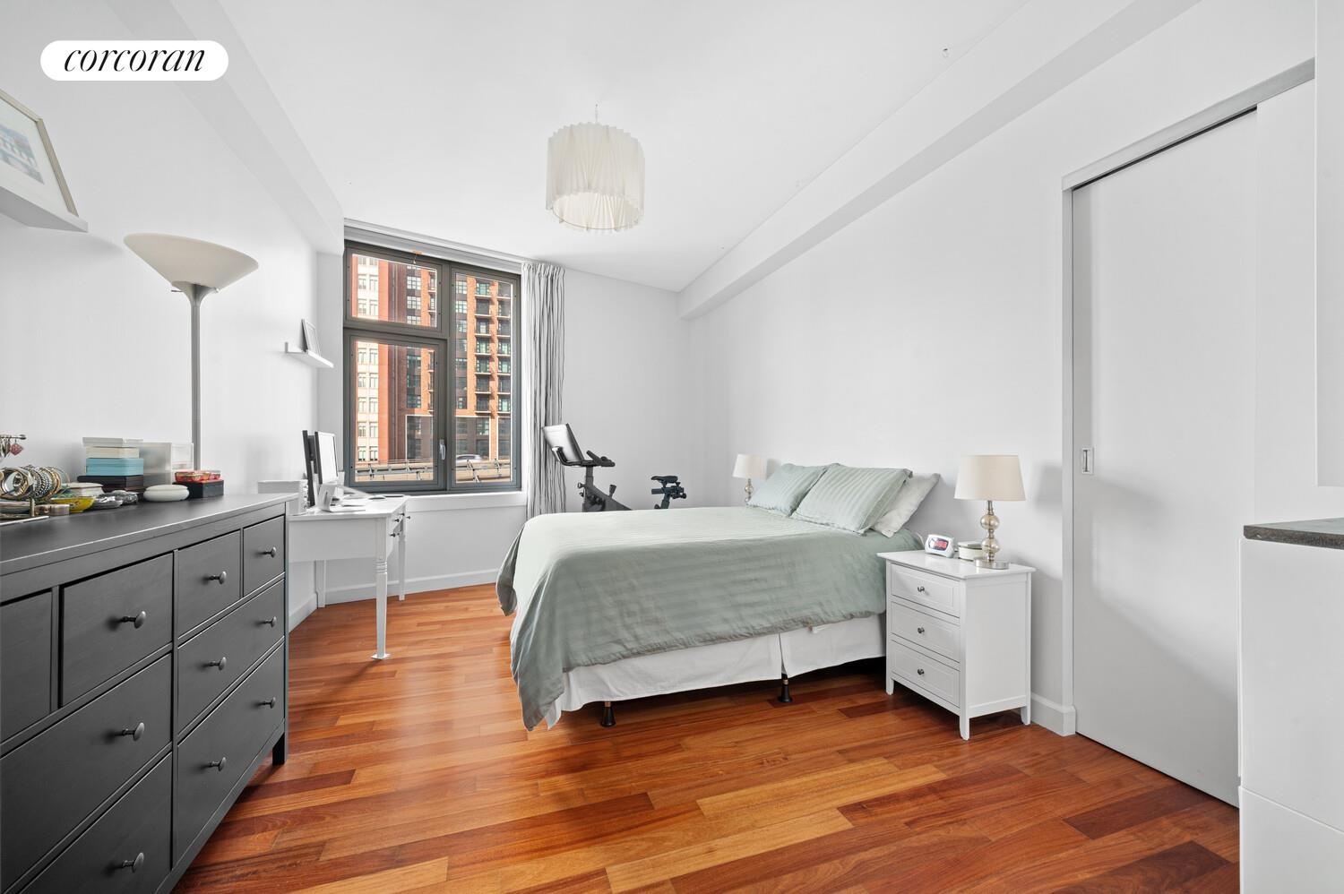 Sunlight pours into this south facing corner one bedroom at 100 Jay Street, where oversized windows and an open layout create a bright, effortless sense of space.
