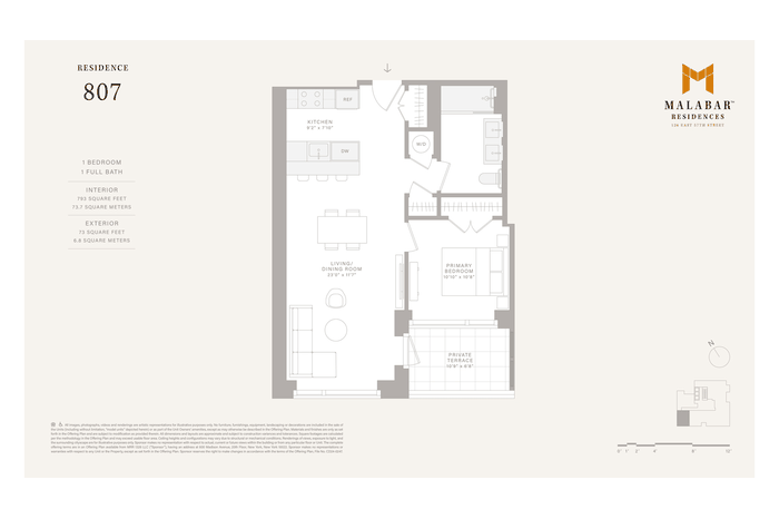 Residence 807 is a 793 square foot one bedroom home with southern exposures, enhanced by a 73 square foot private terrace.
