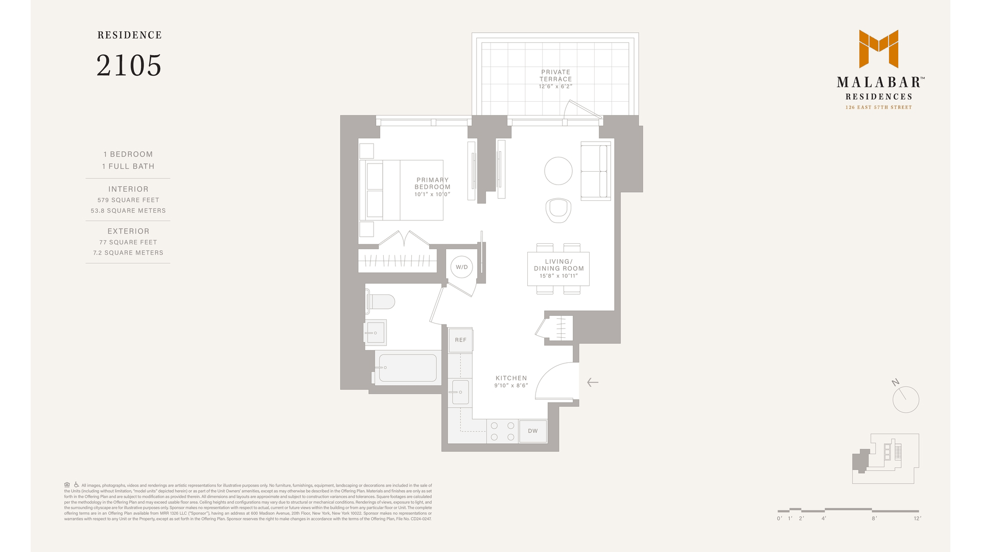 Residence 2105 is a 579 square foot one bedroom home with northwestern exposures, enhanced by a 77 square foot private loggia.