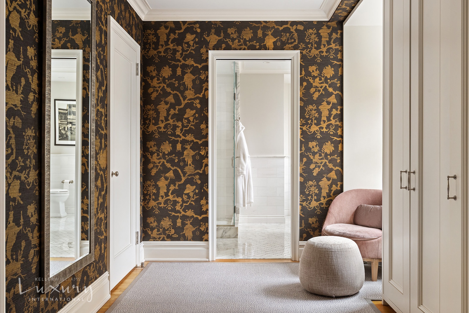 UPPER LEVEL - Inviting resting area and secondary entrance. Expansive primary suite complete with a spacious dressing room, two marble bathrooms and generous closets, including an oversized closet. Comfortable office/den with wood-burning fireplace that can convert easily into a fourth bedroom.