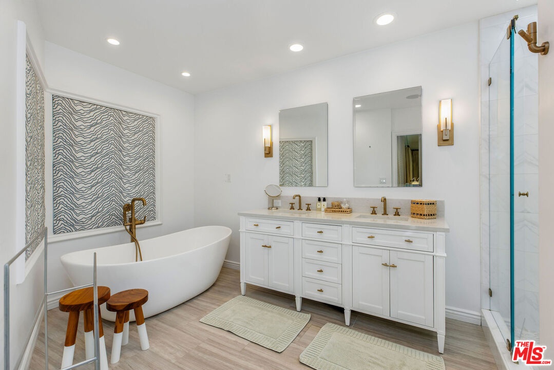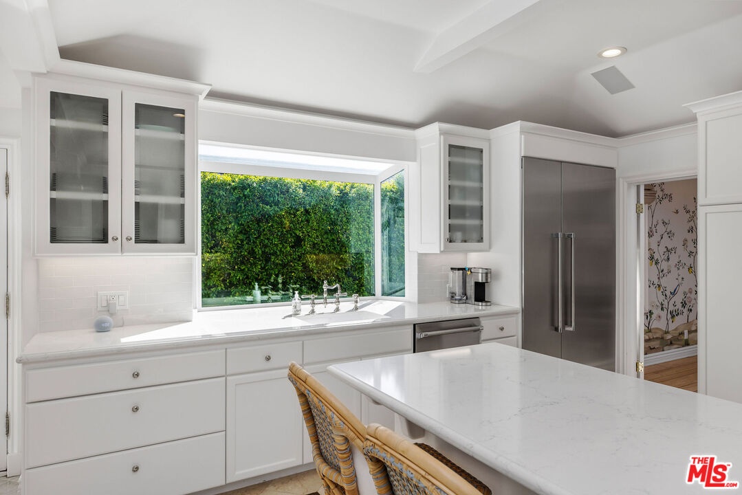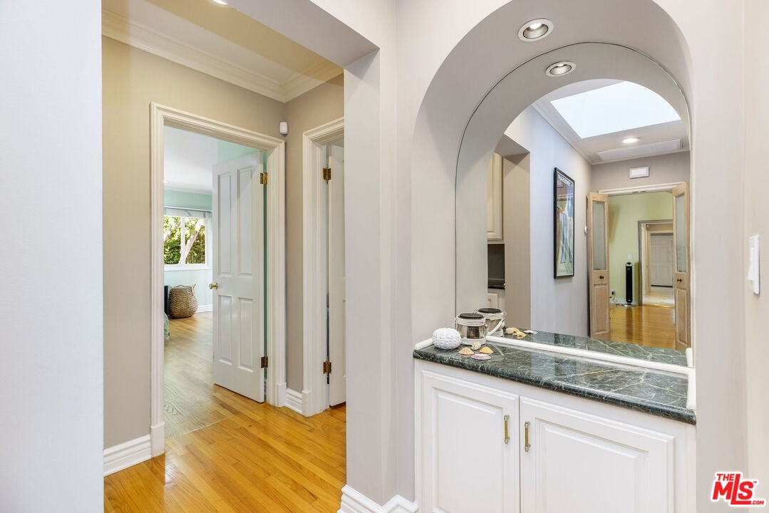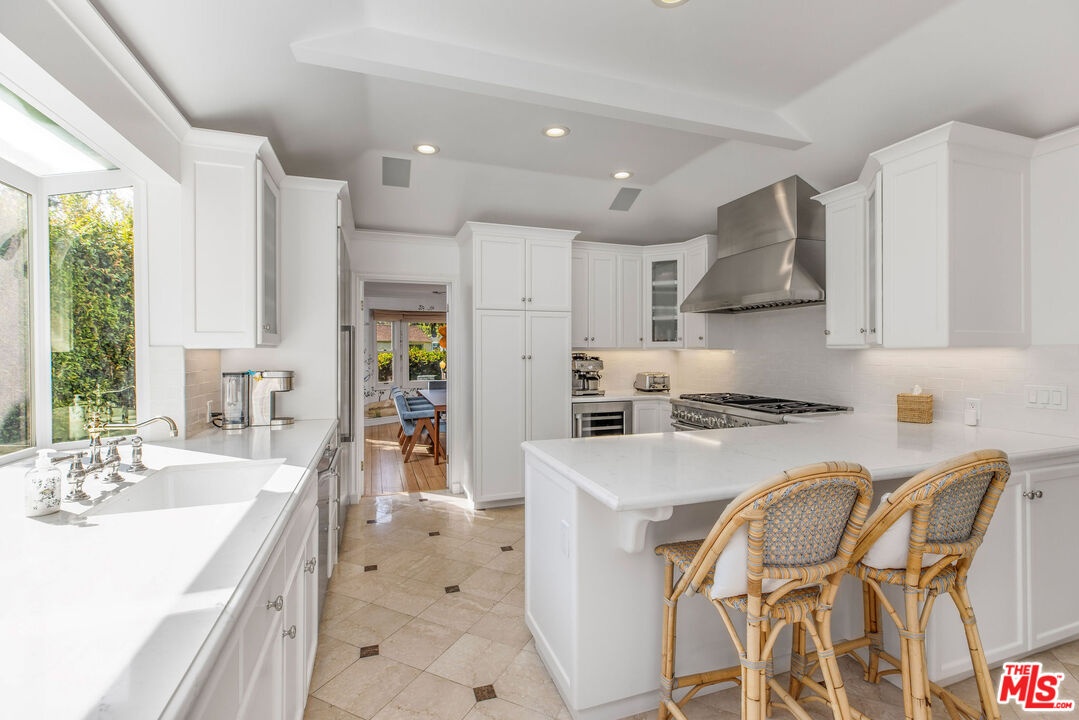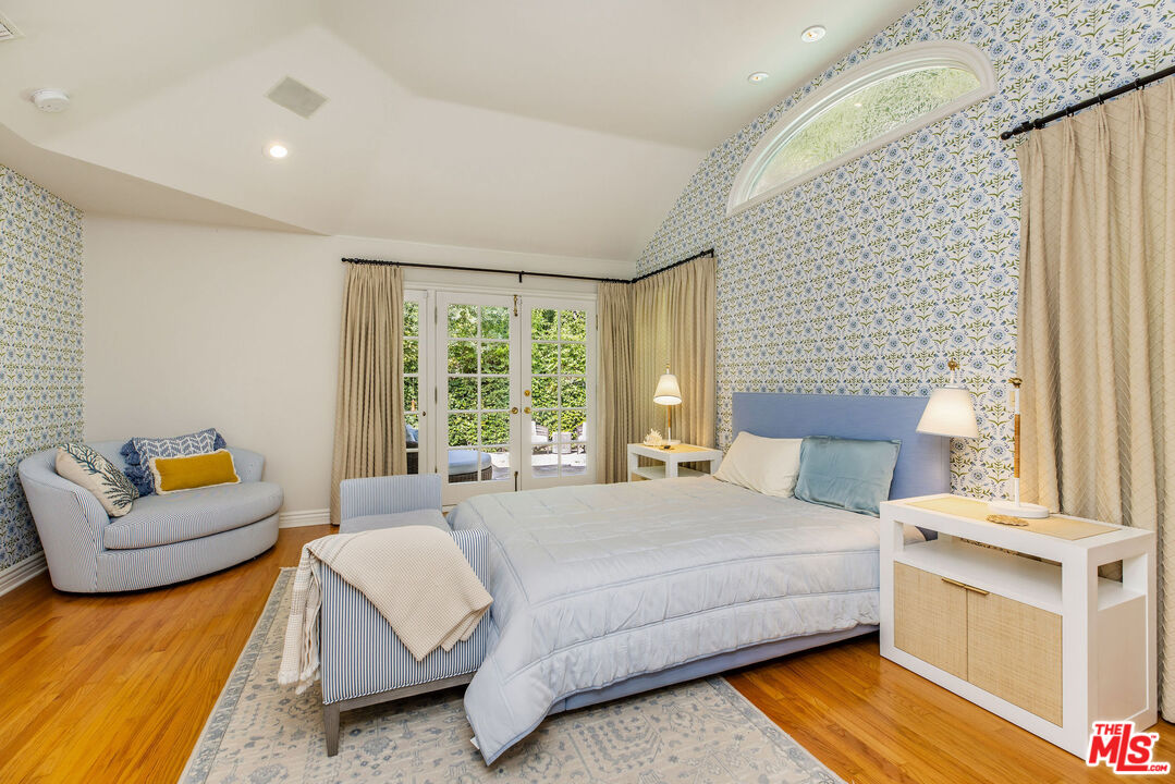 Set up slightly from the street, this single-level, extensively remodeled Traditional home offers a rare opportunity to own a move-in ready property in the prestigious Little Holmby neighborhood of Westwood. Upon stepping into the formal entry from the covered porch, you find a cheery and welcoming home with hardwood floors throughout and natural light streaming in through every room. On one side is a grand formal living room with a stately fireplace, soaring cathedral ceilings, numerous sky lights, and French doors leading to the patio. On the other side is a stately formal dining room with tree-top views encouraging fabulous dinner parties late into the night. Adjoining the dining room is an inviting and updated gourmet kitchen beckoning to the aspiring chef or trained professional. Features include high-end stainless appliances, built-in microwave, wine cooler, white granite counters, multiple workspaces, bay window, bar seating and eat-in breakfast area. The other public areas in the front of the house include a bright separate study/office with glass door to the outside, welcoming family room with peaked, exposed wood ceiling, sliding doors, warm fireplace, and a lovely powder room. The three bedrooms comprise the rear portion of the house with ensuite baths offering total privacy and comfort. The two family bedrooms are generous in size and have copious amounts of closet space. The primary bedroom is a tranquil escape from the hectic world outside with raised ceilings, fireplace, sumptuous bath, large closet and direct access to the pool. The convivial exterior areas are just the icing on the cake for this wonderful home. Accessible from the living room, office, family room and one bedroom is an amazing, private patio bordered by mature landscaping featuring an outdoor kitchen plus barbeque, partially covered dining or seating area and babbling fountain adding just the right touch of atmosphere. This is the space where you will spend all your time entertaining friends for al fresco parties, catching up with family over a glass of wine or curling up with a good book and enjoying the serenity. Additionally, there is a sparkling pool at the back beckoning all to come and enjoy a playful afternoon of water sports. The house also has a lower direct access garage with a storage area lined with shelves and closets perfect for immediate storage after a successful Costco run and laundry area with laundry chute from above. Located just minutes away from the relaxing atmosphere at Holmby park, the world-class shopping at Century City Westfield mall, the glamour of Beverly Hills, the vibrant nightlife of West Hollywood, the cultural offerings of UCLA/Westwood and the prestigious, award-winning Warner Avenue elementary school, this is the house you have been waiting for.