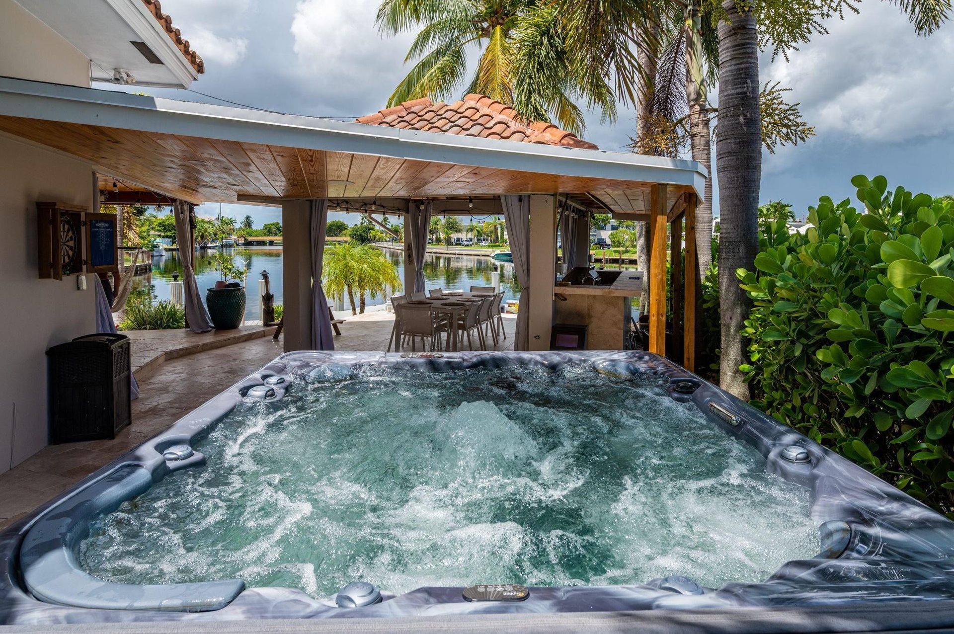 CUSTOM-BUILT WATERFRONT MASTERPIECE – Recently renovated 5-bedroom, 3.5-bath home with 2-car garage on a private cul-de-sac. This one-of-a-kind residence offers approx. 3,200 sq. ft. under air and 140 feet of waterfront with a 120-ft dock w/water & electric, providing space for a large boat and jet skis. Enjoy wide-water views, impact windows & doors, and an entertainer’s backyard with a heated pool, hot tub, summer kitchen, wet bar, tiki hut, gazebo, fire pit & covered patio..Perfect for gatherings or relaxed coastal living. Inside features an open layout, modern finishes, oversized beverage fridge, primary suite with a w/built-in bar. A true entertainment paradise where luxury meets waterfront lifestyle.- Property is available for Seasonal Rental as well as Annual Property for Immediate OcupancyProperty can be made available for Seasonal or Annual Rental.Contact Agebt for Details.