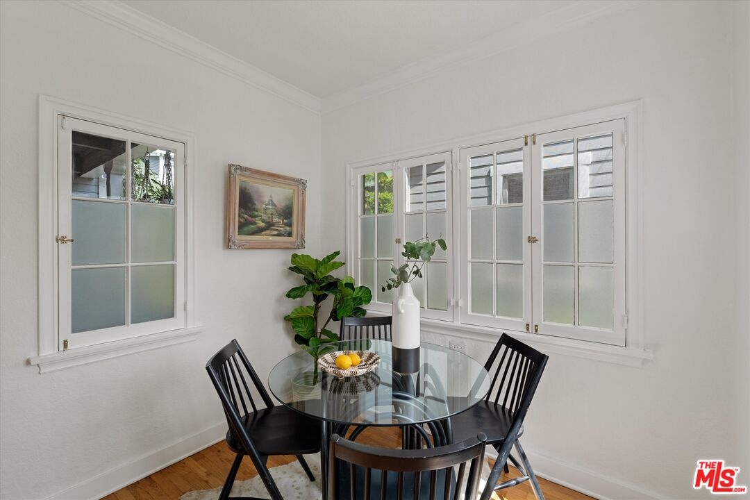 Welcome to 2510 4th Street, a rare 1920s condo in prime Ocean Park, Santa Monica, tucked within a lush, private garden-style community just a few blocks from the sand. Set all the way in the back of the property and quietly off the street along a path shaded by mature trees, flowering foliage, and greenery, this unit offers exceptional privacy and a peaceful, storybook setting, the beach lifestyle epitomized. The sense of quiet enhances the feeling of retreat, while incredible natural light and ocean breezes flow throughout. A welcoming wooden front porch with a swinging bench sets the tone, perfect for slow mornings or relaxing evenings. Inside, the home is filled with warmth and character, featuring original hardwood floors throughout, crown molding, high ceilings, and beautifully updated windows that fill the space with natural light. The living area feels bright and inviting, while a classic archway leads to a separate, private dining nookcreating a distinct space for dining framed by charming windows. The two-bedroom, one-bath layout offers great closet space and an easy, functional flow. The kitchen blends vintage appeal with everyday convenience, complete with tiled countertops, a Viking oven, and timeless details. Within a unique enclave of bungalows surrounded by lush landscaping and open space, each home feels like its own retreat. Enjoy close proximity to Main Street's shops, restaurants, and cafes, with convenient access to Rose Avenue and Abbott Kinney, and just moments to the beach bike pathperfect for embracing the best of Santa Monica beach living.