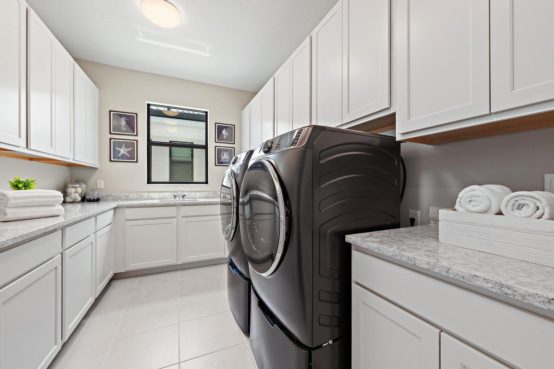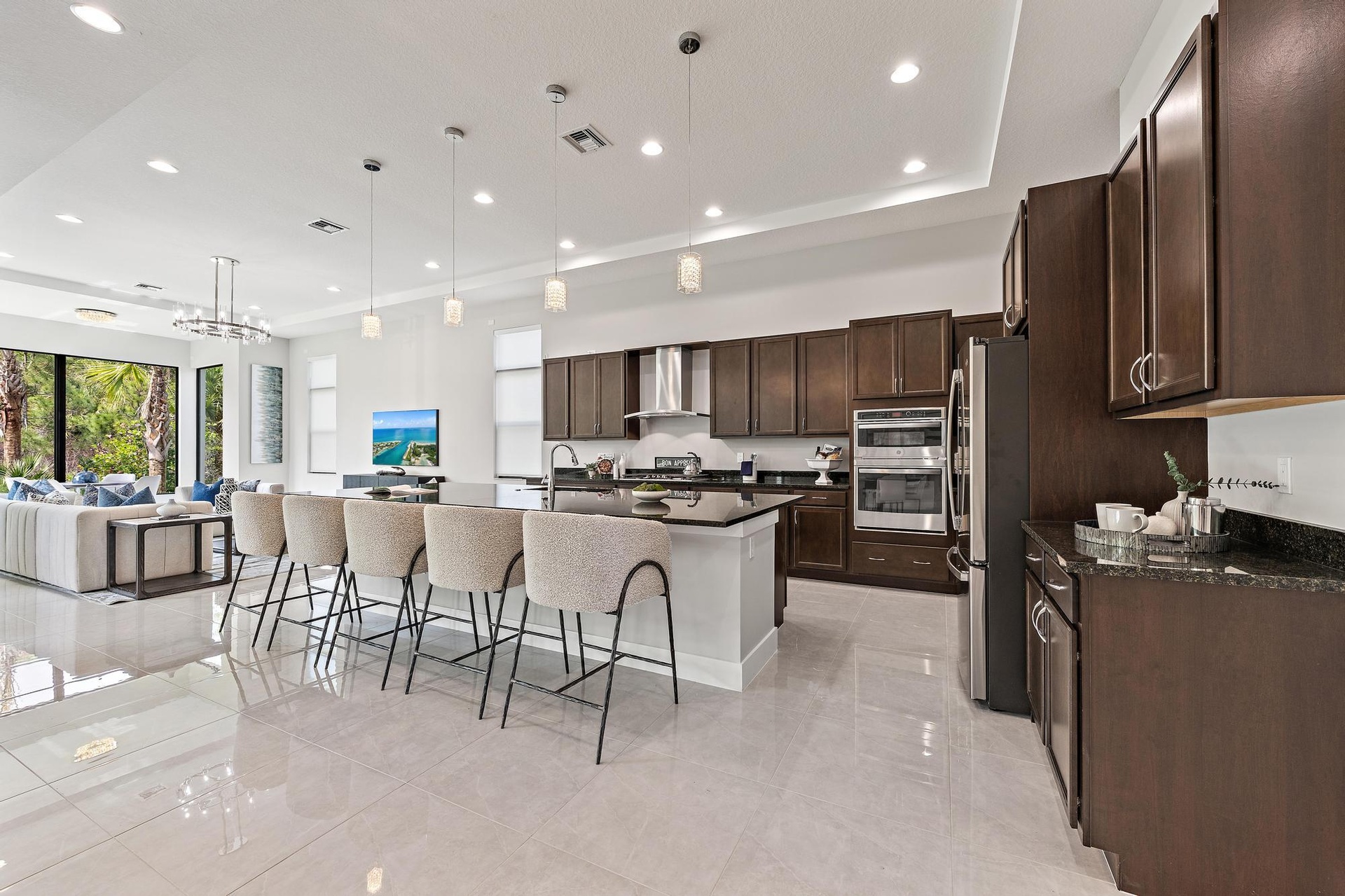 Welcome to 13358 Artisan Circle, a pristine, never-lived-in residence set within the exclusive, manned-gated community of "Artistry" in Palm Beach Gardens. Completed just months ago, this home offers a rare opportunity to enjoy brand-new construction with a sense of quiet luxury, comfort, and ease. A custom glass entry door welcomes you inside, where natural light fills the space and highlights the home's breathtaking vaulted ceilings and elegant lighting. The atmosphere is open, airy, and effortlessly refined. This home is equally suited for everyday living or gracious entertaining, whether as a full-time residence or a second home. Spanning at aprox. 5,167 square feet under air and 6,690 total square feet, this expansive "West" model is one of the largest in the community The thoughtfully designed layout features 5 bedrooms, 5 full bathrooms, and 1 half bath. A first-floor primary suite serves as a private retreat, offering direct access to the backyard. The suite includes dual vanities, a walk-in shower, and an oversized walk-in closet designed for a custom, dream-worthy setup. Also on the main level, a dedicated den or office provides flexibility for work, hobbies, or a quiet sitting area, while the three-car garage adds everyday convenience. At the heart of the home, the kitchen blends style and function with abundant cabinetry, a large island ideal for entertaining, a gas range, and a walk-in pantry. It flows seamlessly into the main living areas, where expansive windows and sliding glass doors fill the space with natural light and showcase tranquil views of the backyard and preserve, creating a calm and inviting atmosphere. Upstairs, a spacious loft with custom built-ins and a beverage refrigerator offers an ideal setting for relaxing or entertaining, with easy access to a private balcony for outdoor enjoyment. Four additional bedrooms are thoughtfully arranged to provide comfort and privacy for family and guests. Outdoor living is equally impressive, featuring a covered patio and an outdoor kitchen, perfect for relaxed evenings and enjoying the surrounding greenery. Built with quality and efficiency in mind, this brand new home includes impact windows and doors, solid construction, and energy-efficient systems designed for comfort and long-term value. Located within Artistry, a gated community developed by Kolter Homes, residents enjoy 24/7 security and resort-style amenities including a pool, clubhouse, fitness center, walking trails, and sports courts. Ideally situated, the home is just minutes from Alton Town Center, Whole Foods, Life Time Athletic Club, and some of South Florida's most beautiful beaches, with convenient access to Palm Beach International Airport. A refined, move-in-ready residence where modern design meets a relaxed, elevated lifestyle.