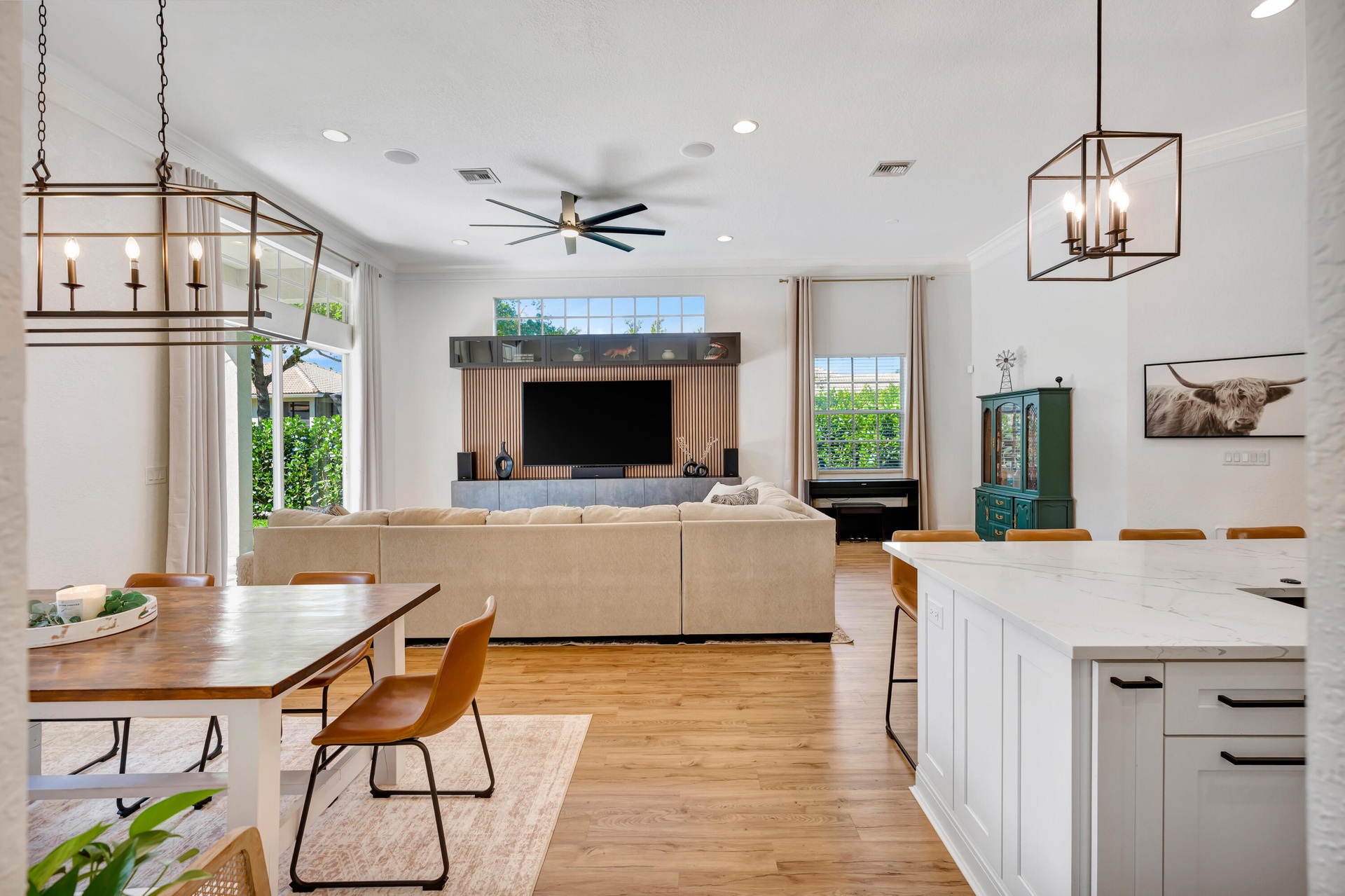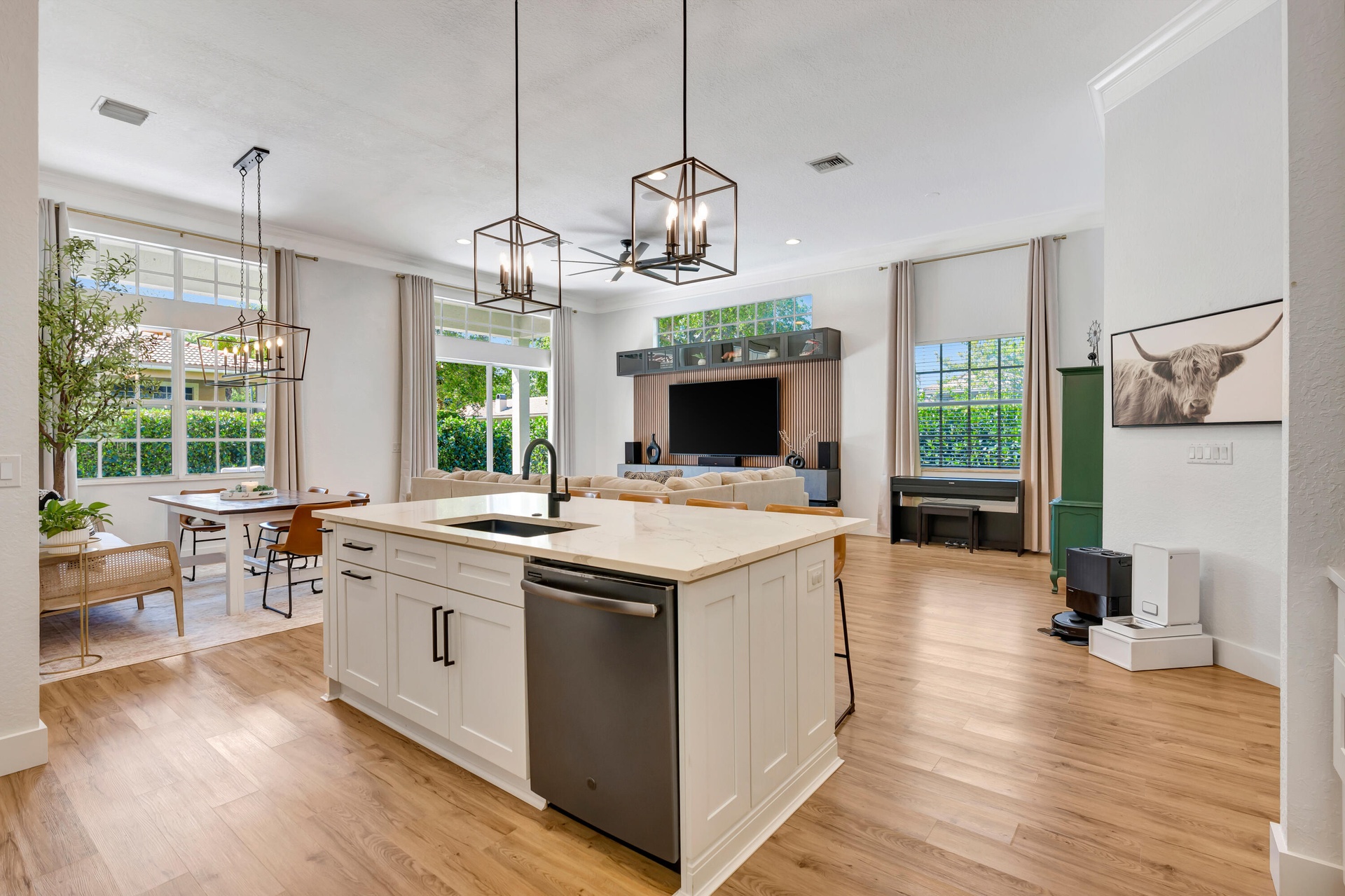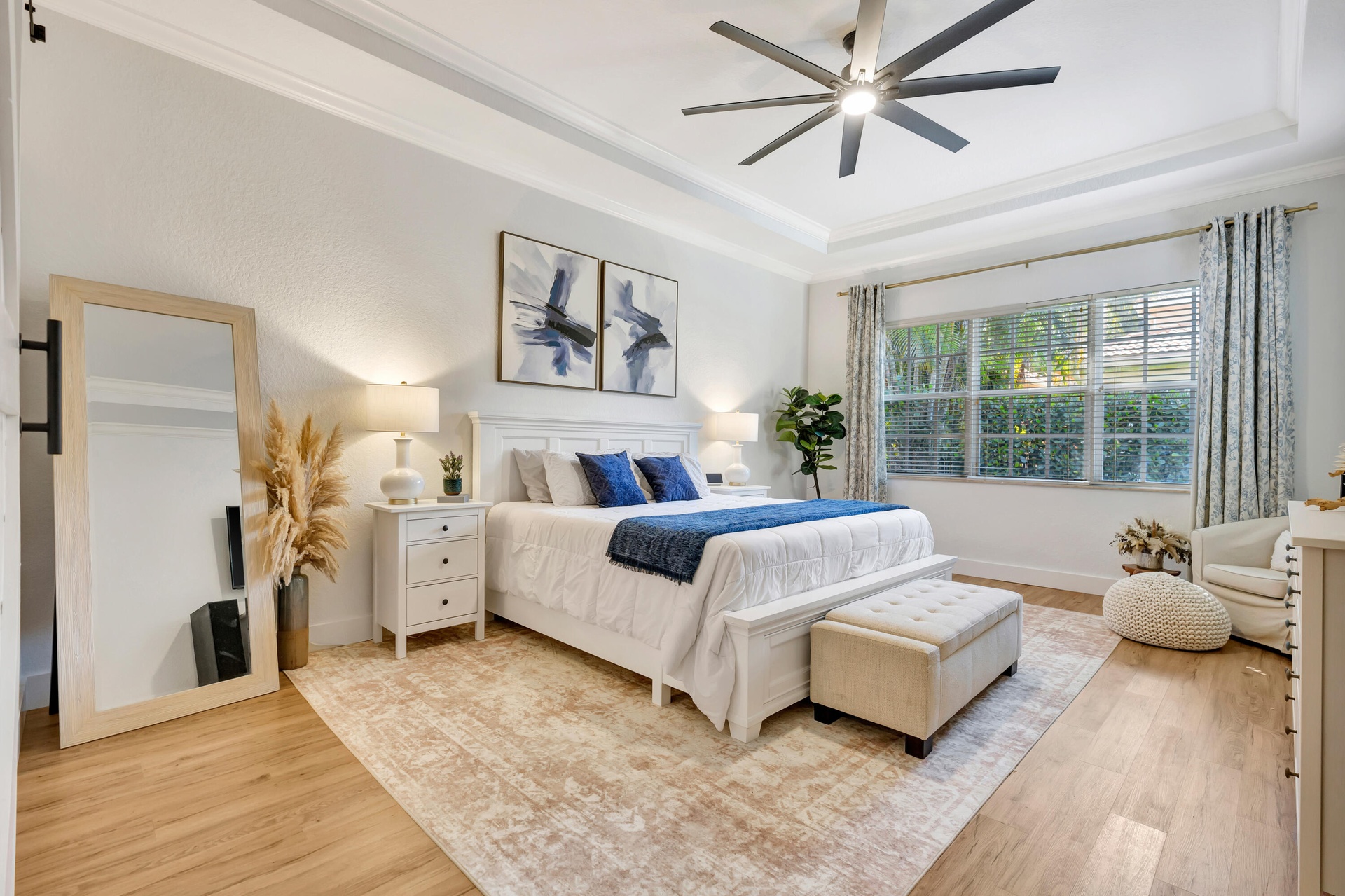 Low HOA ($145/mo!), fully renovated designer Belmont model in the community of Paseos, offering a private preserve-side retreat on a corner lot. This beautifully customized CBS home features 3 bedrooms, 2 full bathrooms, a powder room, a den/study, and a two-car garage across 2,185 sq ft of living space (3,134 total). This beautifully customized CBS home features 3 bedrooms, 2 full bathrooms, a powder room, a den/study, and a two-car garage across 2,185 sq ft of living space (3,134 total). Thoughtfully upgraded for modern South Florida living, it combines soaring 12-foot ceilings in the main areas, luxury vinyl flooring, crown molding, and custom woodwork. The gourmet kitchen (2020) boasts quartz countertops, a 7.5' center island, solid wood soft-close cabinetry, double pantry storage, matte black hardware and matching Black Slate appliances. Interior upgrades include designer-renovated bathrooms, custom built-ins, a striking slat wall media center with built-in speakers, smart home features including Ring and Nest, and fresh interior paint (2026). Outdoor living shines with an extended marble tile patio (2024), redesigned landscaping, expanded yard space, and added privacy, complemented by fresh exterior paint. Paseos residents enjoy resort-style amenities including a beach-entry pool, tennis / pickleball courts, scenic walking nature trails throughout the neighborhood (super cool), two playgrounds, and a newly refurbished clubhouse, all just minutes from beaches, dining, shopping, and downtown West Palm Beach, Palm Beach Gardens, and Palm Beach Island.