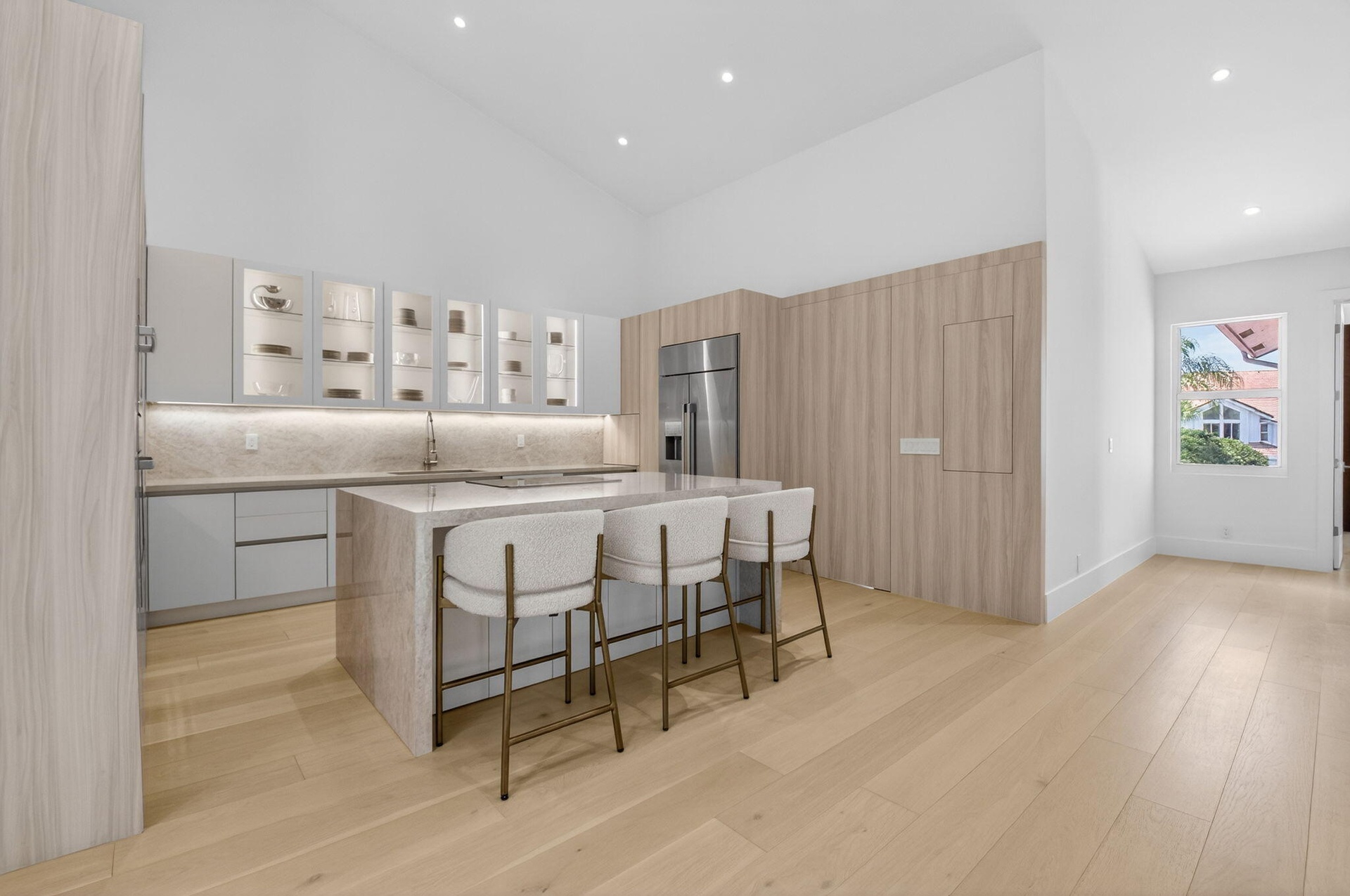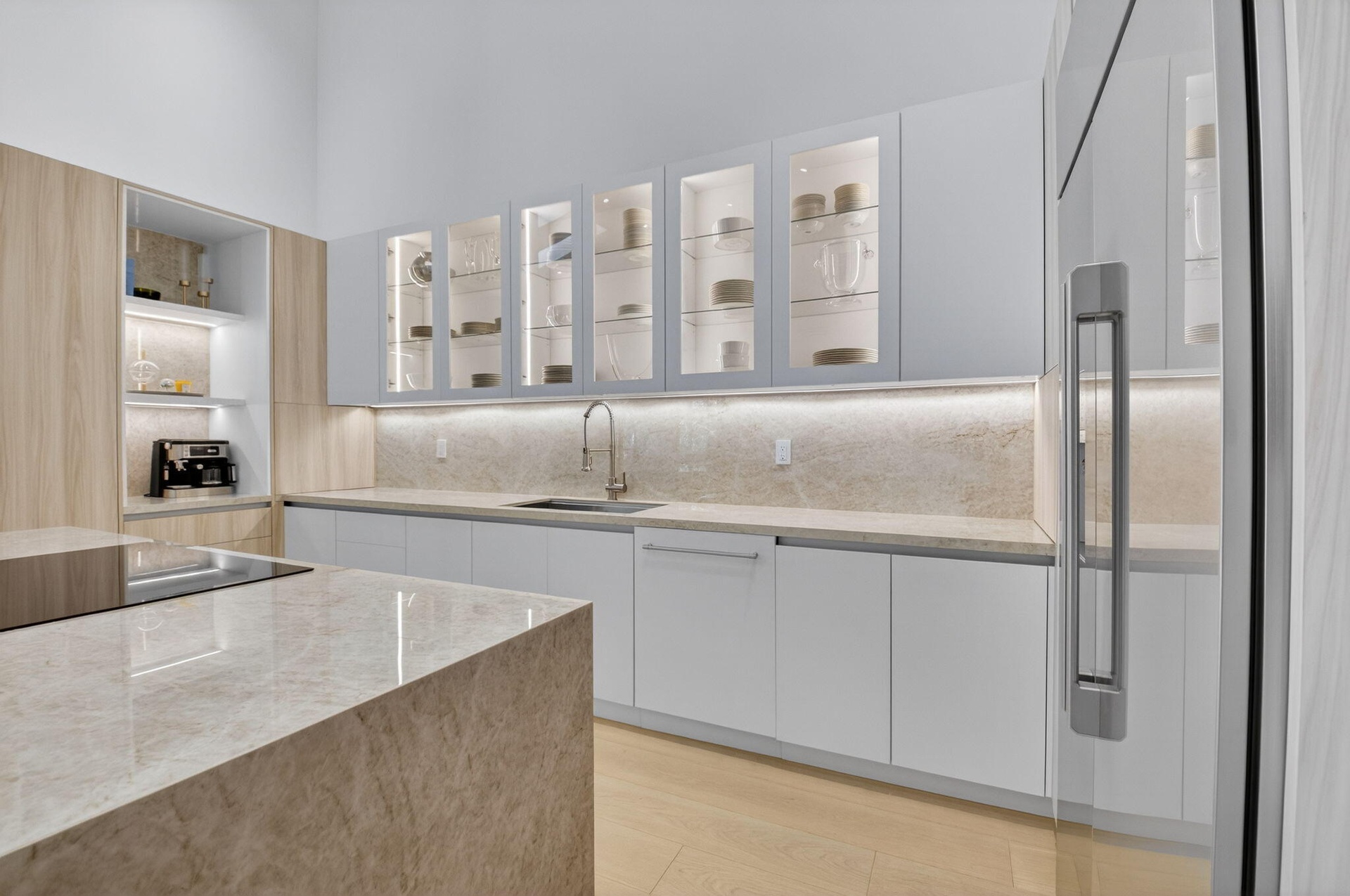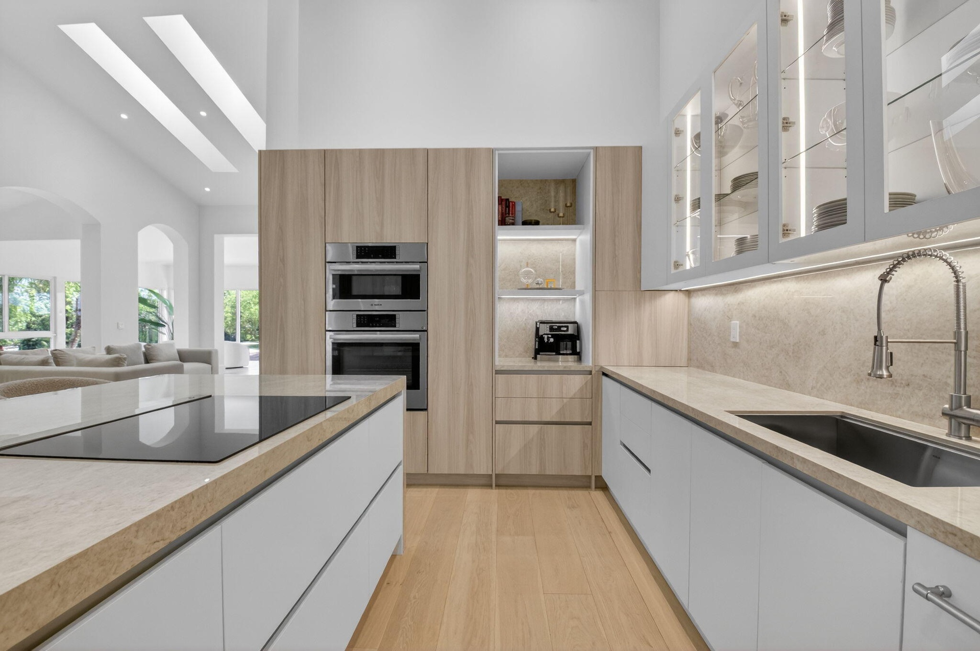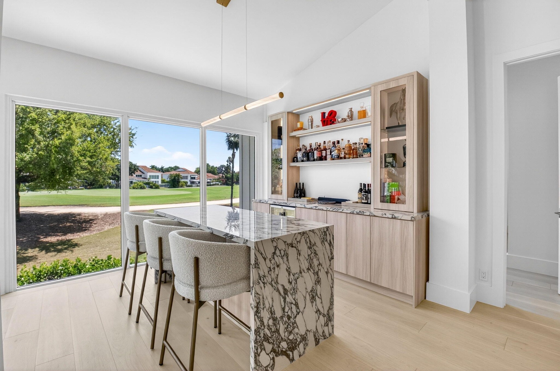 Welcome to this spectacular, fully renovated penthouse offering 3 bedrooms + office, 3.5 bathrooms, and 2,950 square feet of thoughtfully redesigned living space. This residence features a private elevator and stunning panoramic golf course views. Completed in 2025-2026, the home showcases high-end modern finishes, volume ceilings, and an open floor plan ideal for both everyday living and entertaining. Expansive wraparound impact windows flood the home with natural light while showcasing beautiful, unobstructed views of the golf course. The designer kitchen features a large island and quartz countertop, sleek custom cabinetry, premium appliances, and a seamless flow into the living and dining area. Enjoy your favorite drink at the beautiful custom bar with a waterfall countertop and seating, creating the perfect space to entertain. The split-bedroom floor plan provides ultimate privacy, with each bedroom offering its own en-suite bath. A fourth room features a unique hidden door, making it ideal for a home office, media room, or playroom. This home is one of a kind! Come experience a sophisticated yet comfortable lifestyle at Broken Sound, one of Boca Raton's most sought-after country clubs.