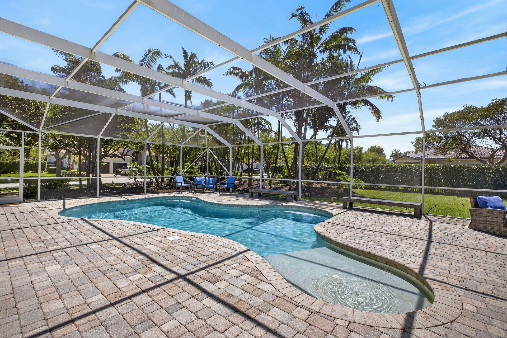 Stunning updated 5-bed/5.5-bath estate home on builder's acre in gated Highland Ranch Estates. Modern open floor plan enhanced by soaring ceilings, a gourmet kitchen with quartz countertops, and GE Profile appliances—including new dishwasher and smart AI washer/dryer. The spacious primary suite boasts dual closets and a luxurious bathroom with individual vanities, separate toilets, and a bidet. A private guest wing offers 3 ensuite bedrooms with attached baths. 5th bedroom outfitted as executive office. Oversized screened pool, expansive patio & full cabana bath w/ shower. Recent upgrades include a 2022 roof, 150k BTU pool heater, tankless water heater, EV charger, and new irrigation pump. 3-car garage w/ workbench & storage. Paver circular driveway & huge yard with separate fenced dog run