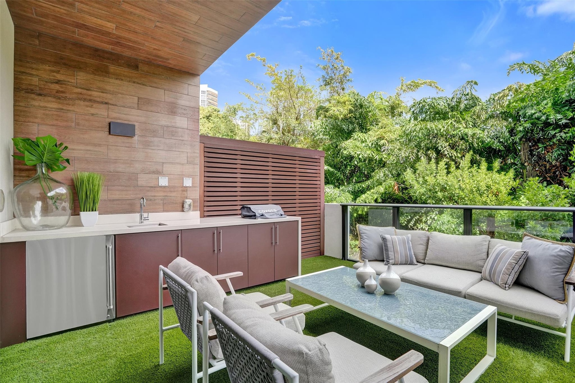 - summer kitchen includes an electric grill, refrigerator, sink & storage