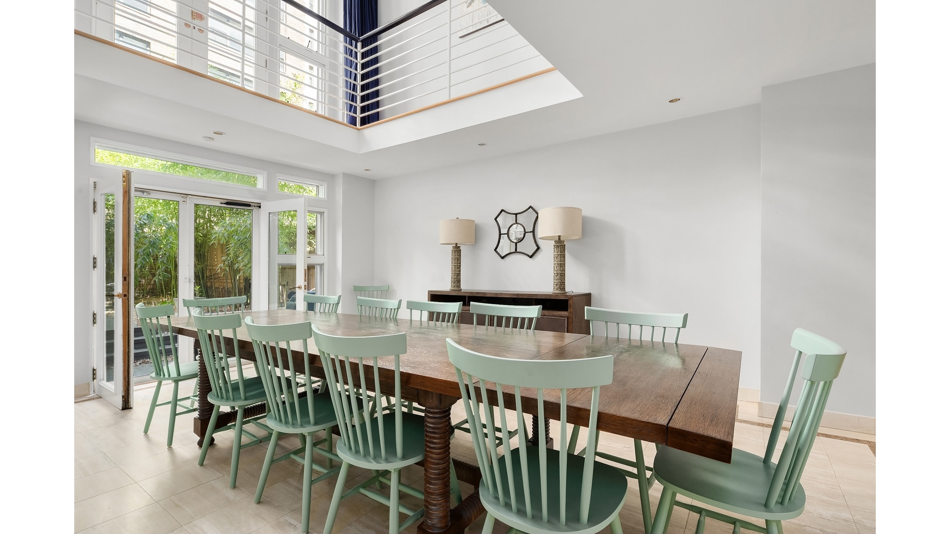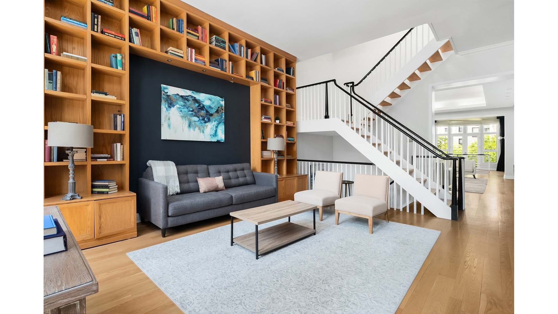 The second floor is designed for both relaxation and entertaining, offering a sophisticated library and living area lined with custom bookshelves and anchored by oversized south-facing windows. French doors open to a Juliet balcony overlooking the garden, while the open layout above the dining room enhances the home's sense of volume and connection.