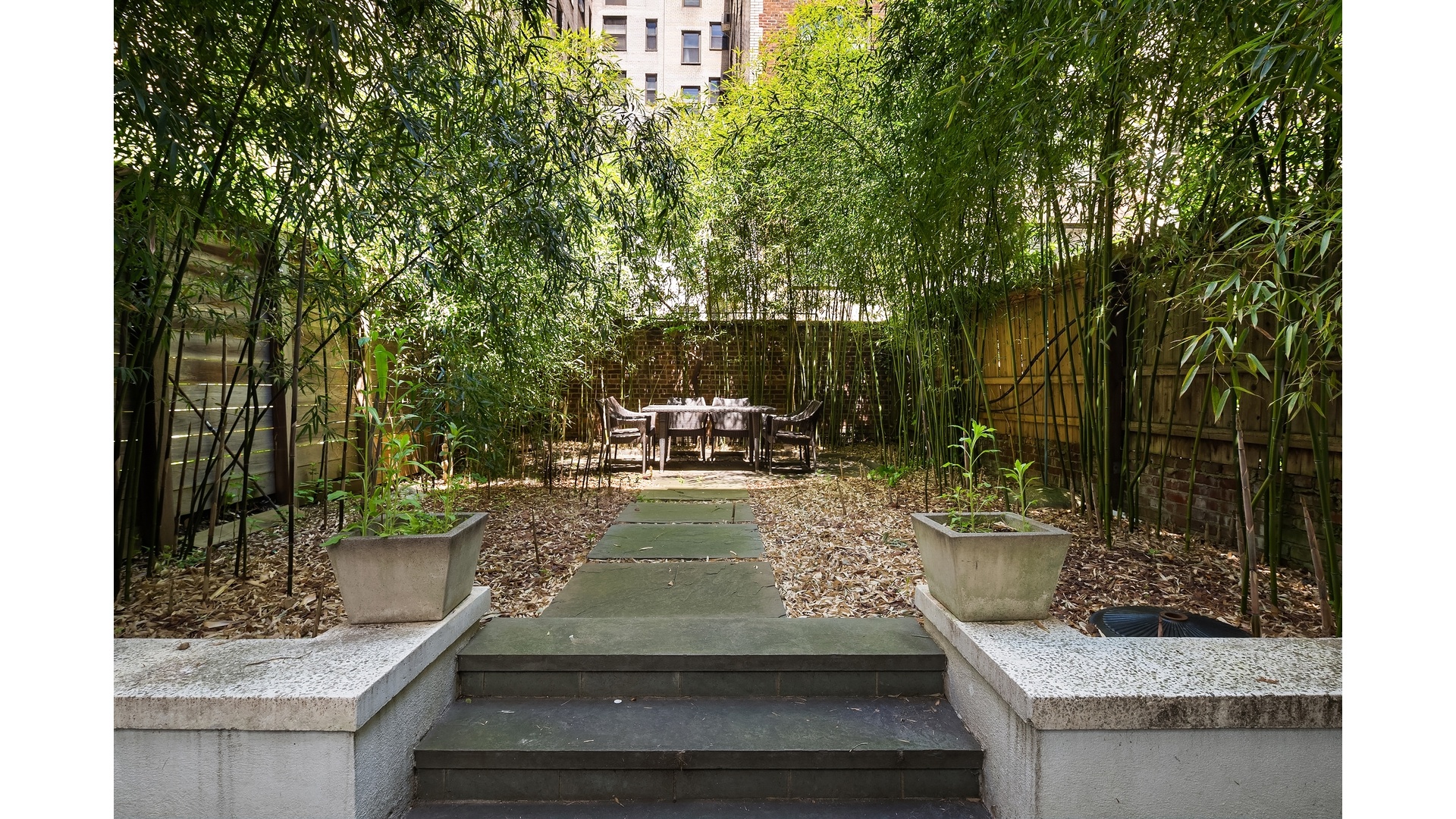 Enter on the garden level, where a stunning chef's kitchen serves as the centerpiece of the home, featuring granite countertops, custom maple cabinetry, and full-sized stainless steel appliances. The adjoining formal dining room has a dramatic double-height ceiling that opens to the level above, allowing sunlight to pour in and create an airy, inviting atmosphere. Just beyond, a beautifully landscaped private garden provides a peaceful retreat for outdoor dining.