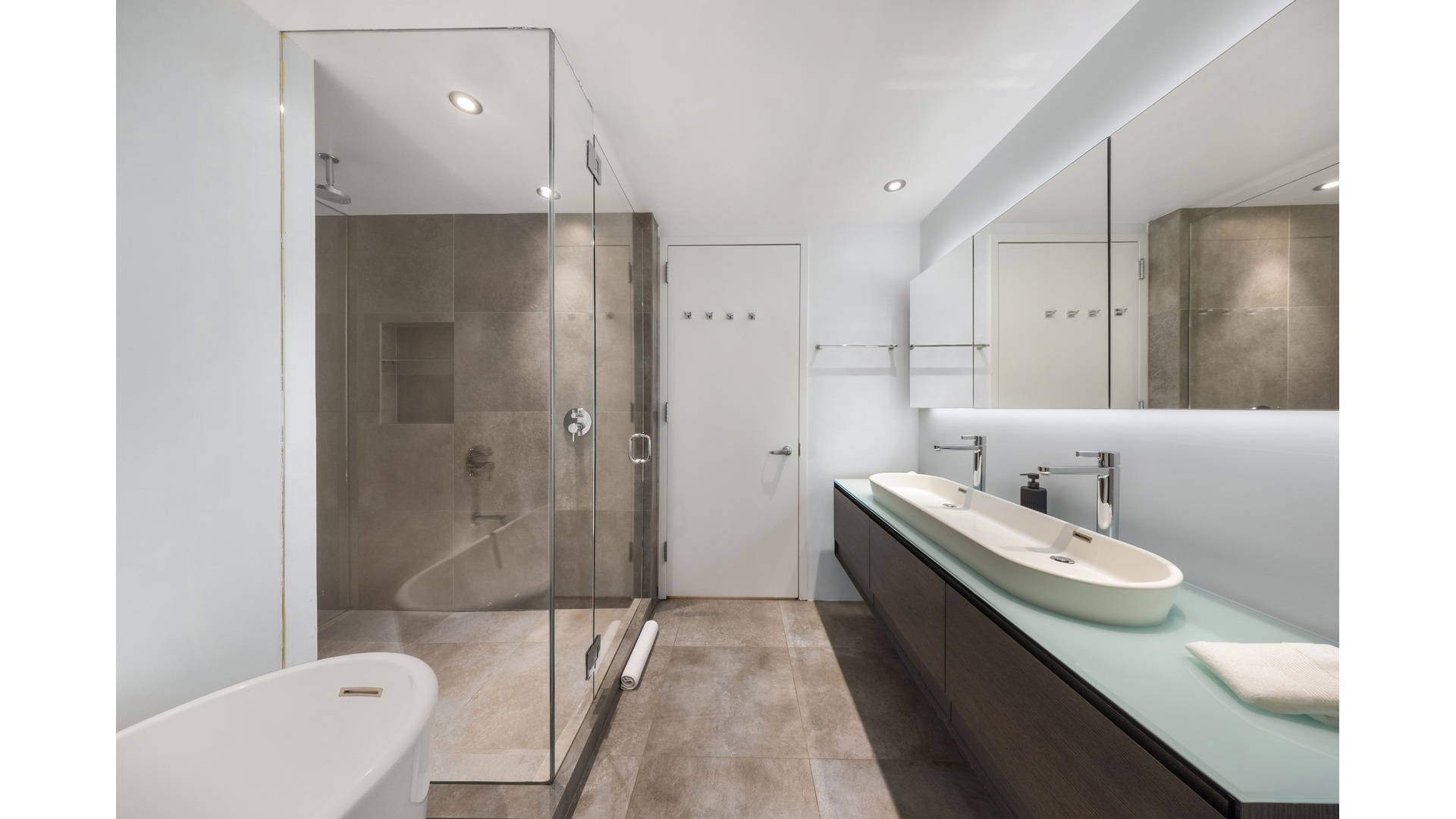 You enter through a proper foyer, a subtle but meaningful transition before the home reveals itself. Beyond it, the living and dining room opens into an almost 500 square foot space, spanning over twenty feet in both directions. This wide, open living area is complemented by a 700+ square foot irrigated, gas grill-equipped garden, creating a seamless transition between indoor and outdoor living. The entire property faces south with unobstructed exposure, filling both the interior and garden with an abundance of natural light.