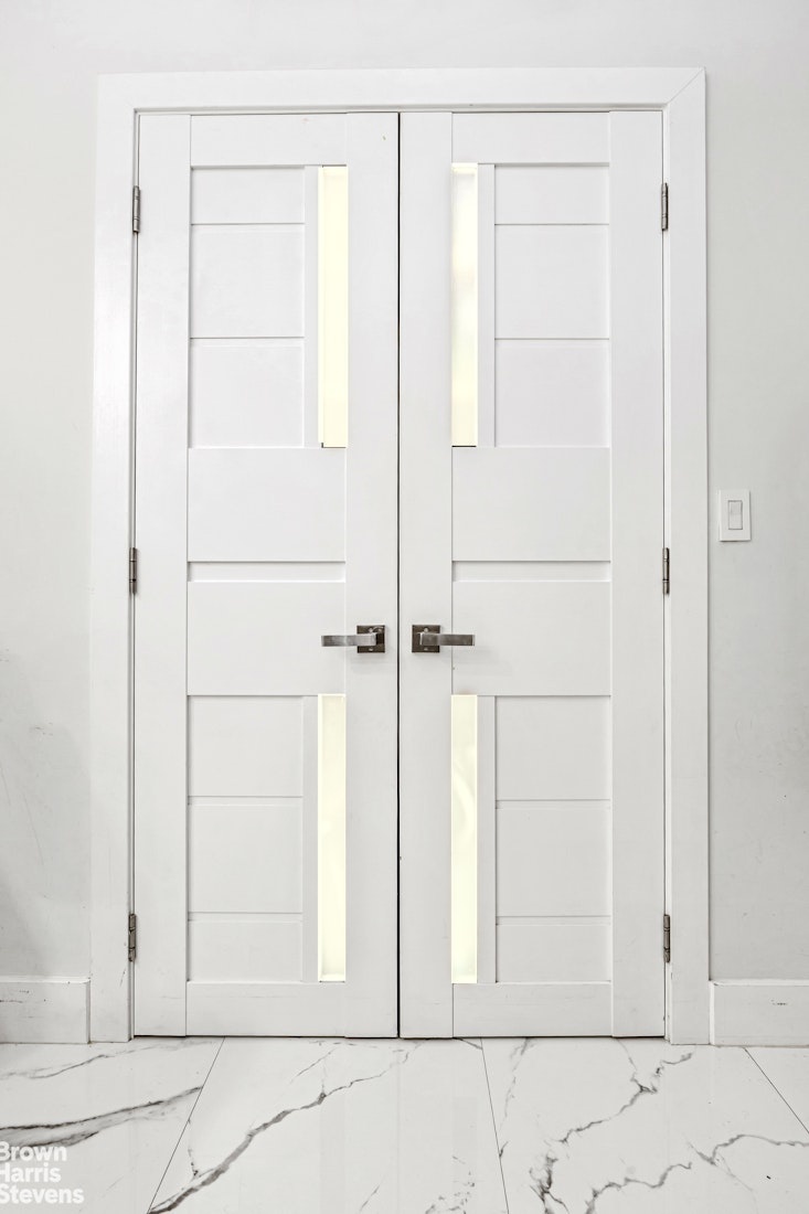 Gorgeous stone floors paired with custom architecturally oversized doors on all the bedrooms, closets and bathrooms featuring decorative raised panels of wood and frosted glass panels, give this home that modern gallery vibe.. A new central air conditioning system will keep you comfortable all year without relying on the building time table.