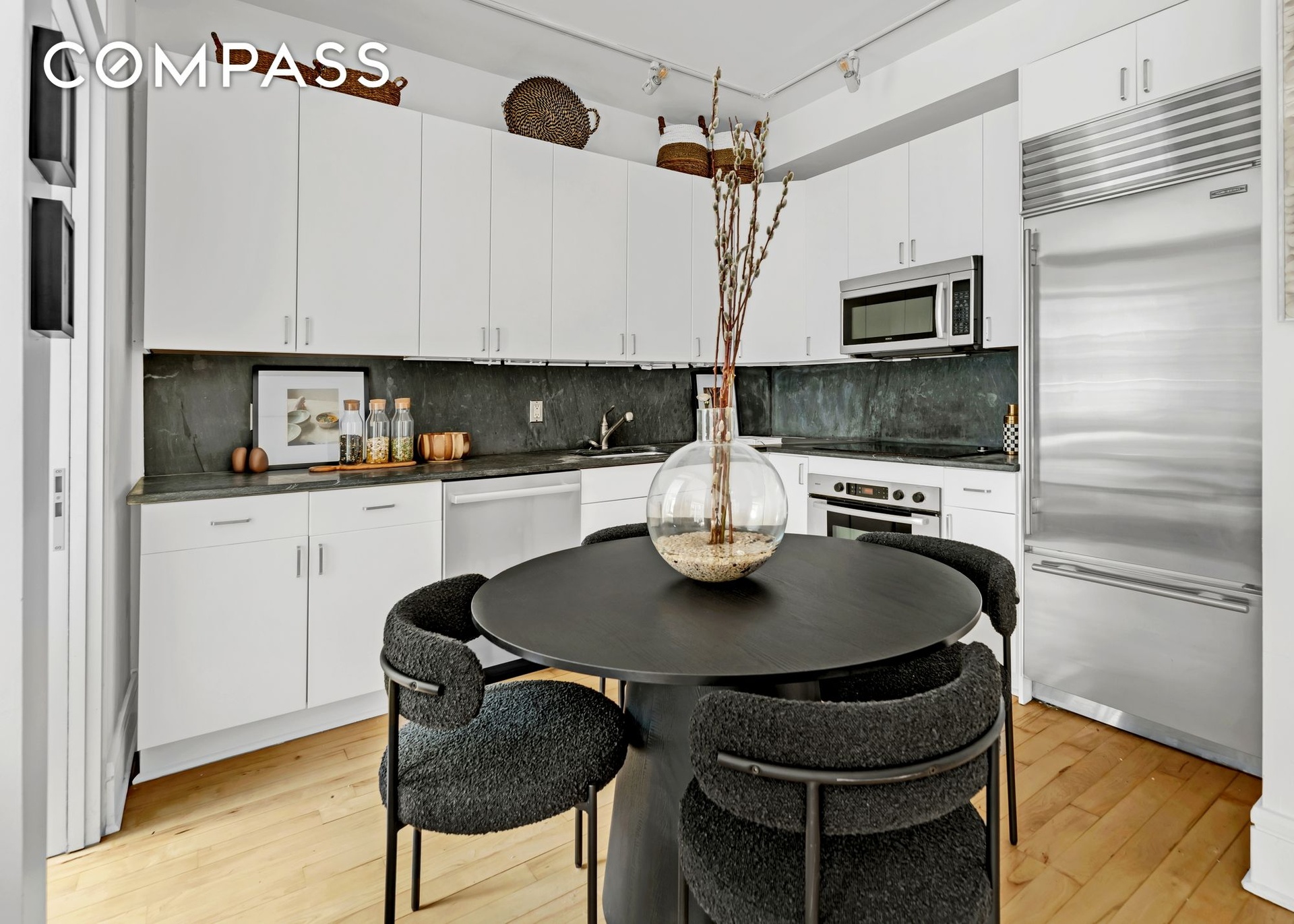 Anchored by floor-to-ceiling, sun-kissed windows -- and two sliding doors that allow you bring an indoor-outdoor vibe to this home -- the open-plan living room is comfy, cozy, and lovely. With an area for working from home and good closet space, this entertaining room opens beautifully to the open-plan, eat-in kitchen. Good looking and practical, the kitchen boasts stainless steel Bosch & Sub-Zero appliances, honed soapstone countertops, and good cabinet space. Crowned by clerestory windows that expand this home's glorious light, the peaceful bedroom space is a tranquil retreat with big, bright windows and served by a big designer bath with Kohler fixtures and large soaking tub.