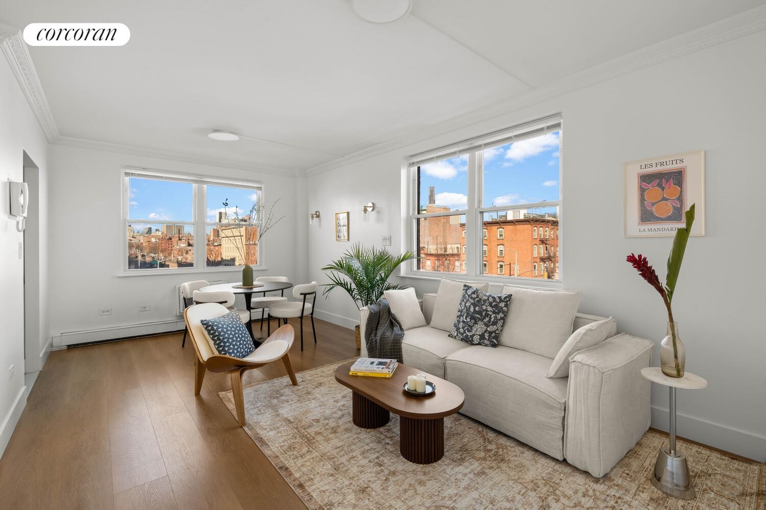 To the rear of the building are two well-proportioned and flexible bedrooms, each comfortably fitting queen or king-sized setups along with room for additional furniture. There's also great storage throughout with multiple closets, and the windowed bathroom has been cleanly renovated with a crisp, modern finish. Additionally, the apartment is outfitted with 3 through the wall AC units along with baseboard heating for optimal convenience! A central laundry is in the basement of the building.