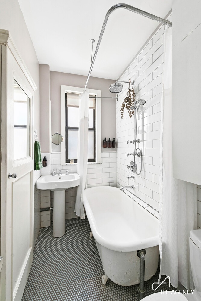 The windowed bathroom keeps the home's character intact with a restored clawfoot tub, while adding elevated finishes like penny tile flooring, a Duravit pedestal sink, and updated fixtures throughout. A full-size linen closet just outside adds even more practical storage.