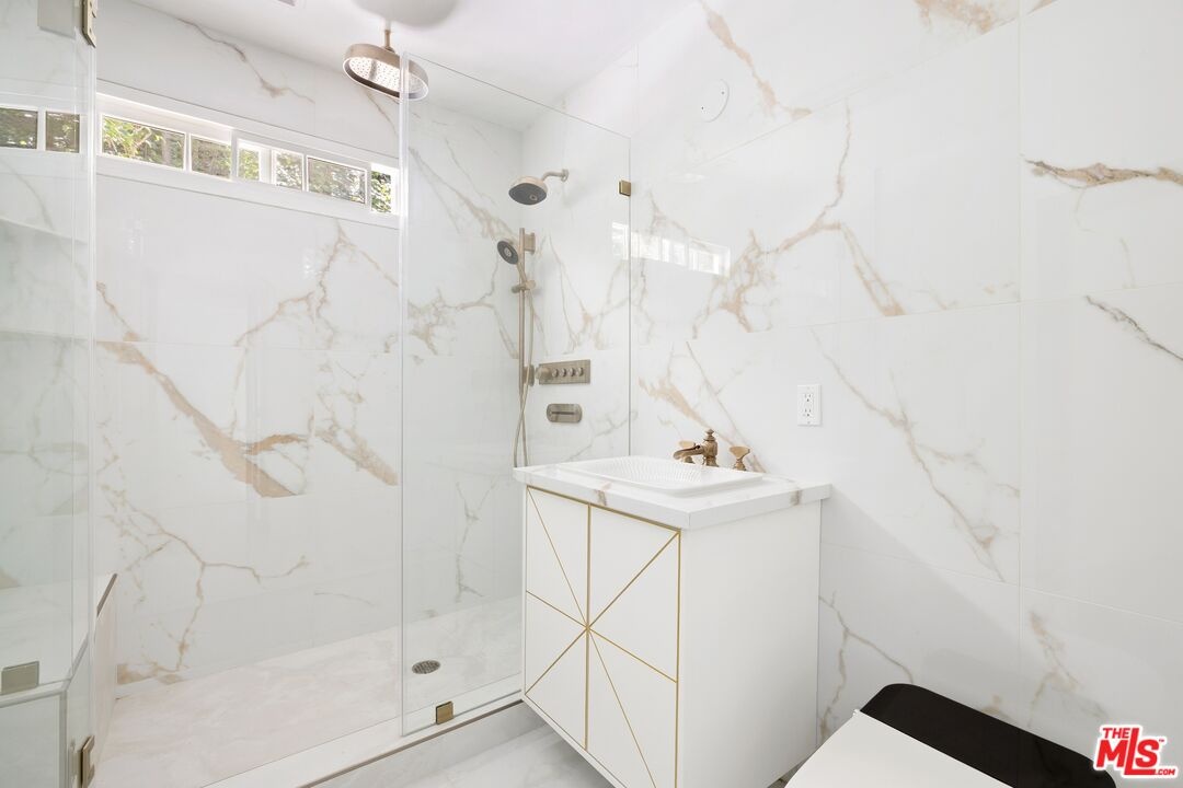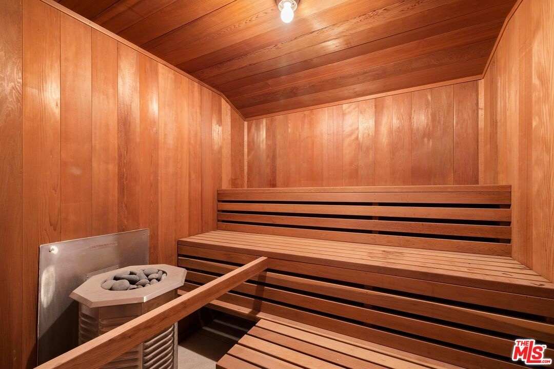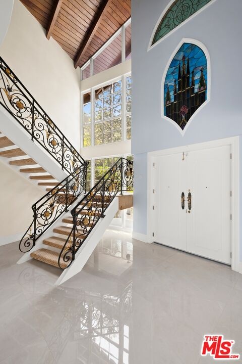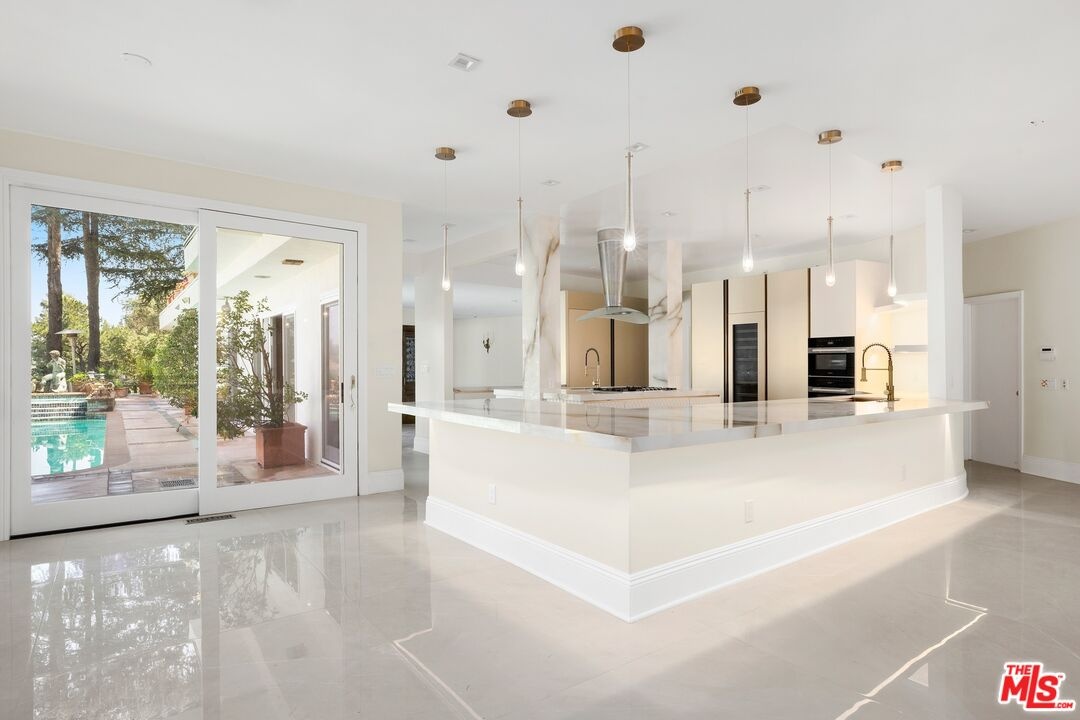 Perched atop prestigious Bel Air with sweeping views over the Stone Canyon Reservoir, this newly reimagined architectural retreat blends timeless design with refined modern luxury. Tucked near the end of a private cul-de-sac, the estate offers exceptional tranquility, privacy, and seamless indoor-outdoor living. A dramatic grand living room with soaring vaulted wood-beamed ceilings, a statement fireplace, and walls of glass opens effortlessly to the expansive grounds, creating an ideal setting for both intimate gatherings and large-scale entertaining. Curated stained glass installation sourced from St. Paul Church introduces a sense of heritage and artistry, casting beautiful natural light and adding a distinctive architectural narrative. The adjacent designer kitchen is a true showpiece, featuring exquisite Italian marble surfaces, custom cabinetry, and a full suite of gold Miele appliances, all anchored by an oversized center island. The formal dining room is elevated by a rare and storied focal point, an original piece from the legendary Chasen's Restaurant bringing a touch of Hollywood history and timeless glamour to the space as well as throughout the home with additional Chasen's windows. The upper-level primary suite is a serene sanctuary overlooking the reservoir, complete with a spa-inspired bath offering dual vanities, a sunken soaking tub, separate glass-enclosed shower, and a private sauna. An expansive walk-in closet also ideal as a dressing room or additional flex space completes the suite. Downstairs, four generously sized ensuite bedrooms provide comfort and privacy, complemented by a dedicated office, powder room, and private housekeeper's quarters. Outdoors, the tranquil grounds evoke a resort-like atmosphere, featuring a sparkling pool, multiple lounge areas, and a dramatic 20+ foot fire pit, an inviting focal point for evening gatherings. A built-in BBQ enhances the outdoor entertaining experience, while a terraced fruit garden just below the main yard offers an array of mature trees, including pomegranate, mango, avocado, and more. A rare offering combining scale, sophistication, and one of Bel Air's most coveted and peaceful vantage points.