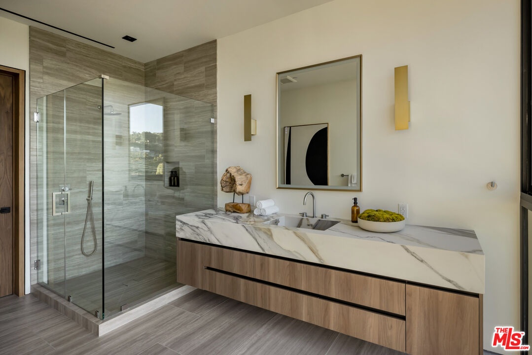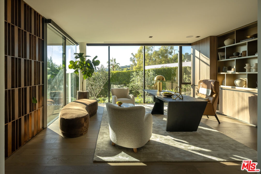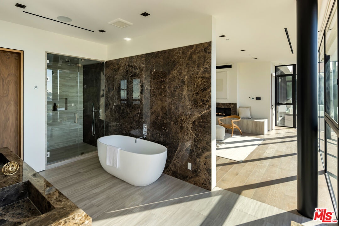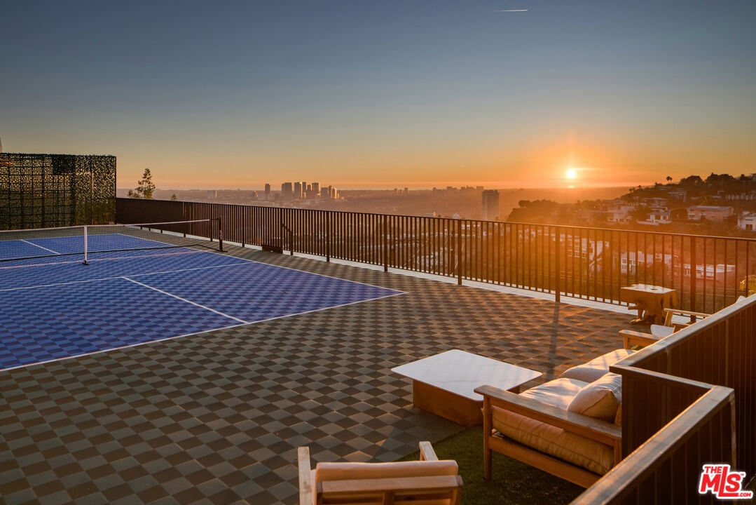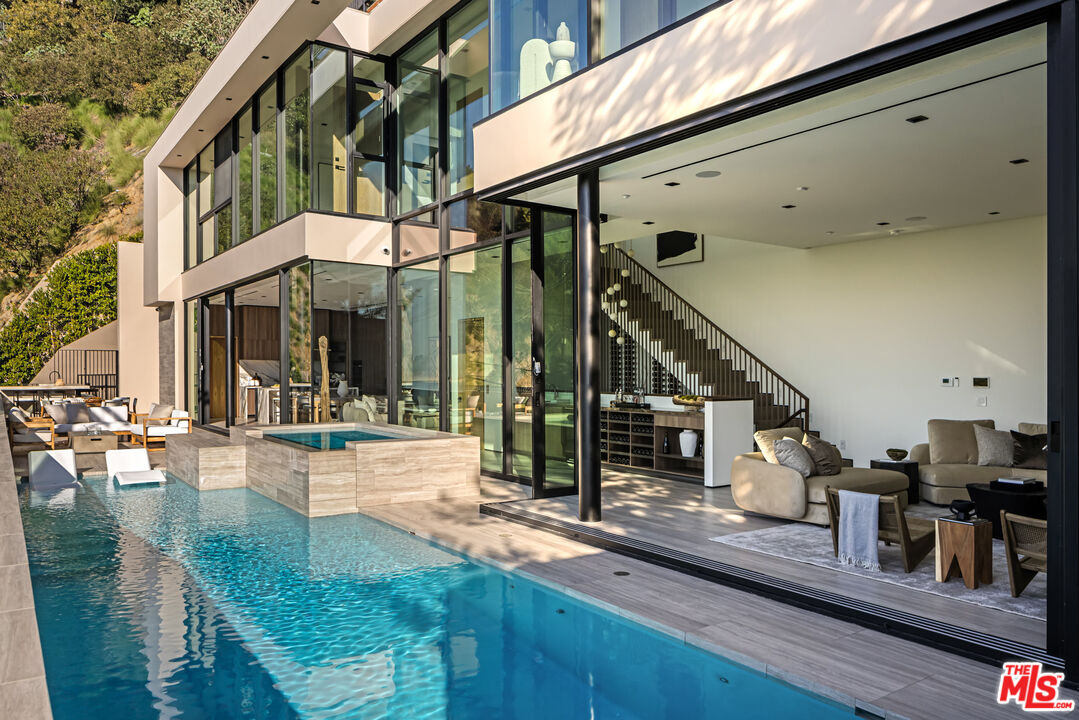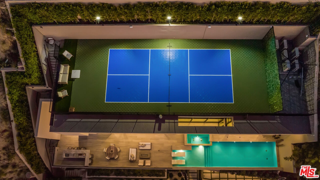 This newly constructed Classic Modern Hollywood Hills residence spans approximately 6,000 square feet and reflects a level of quality, design, and execution rarely found in new construction. Conceived and built by well known, experienced, design-driven team, the home emphasizes thoughtful architecture, refined materials, and seamless livability throughout. The floor plan offers four bedrooms plus a dedicated office, anchored by wide-plank walnut floors and travertine stone that bring warmth and cohesion to the interiors. The kitchen is outfitted with a full suite of Miele appliances. Floor-to-ceiling Fleetwood doors and windows frame sweeping ocean and city views while creating effortless indoor-outdoor flow. Every element of the home was carefully considered, from the proportions of the living spaces to the precision of the finishes. Amenities include an elevator, full smart-home integration, generous storage, wet bar, and wine refrigeration. A three-car garage with additional driveway parking an uncommon luxury in the Hills adds both convenience and functionality. Outdoor spaces are equally well executed, featuring a pool and spa, outdoor kitchen, full bar, fire pit, and a private pickleball court, all designed to maximize privacy, views, and year-round entertaining. This is a highly refined, turnkey offering that blends architectural integrity with modern luxury living in one of Los Angeles' most sought-after settings.