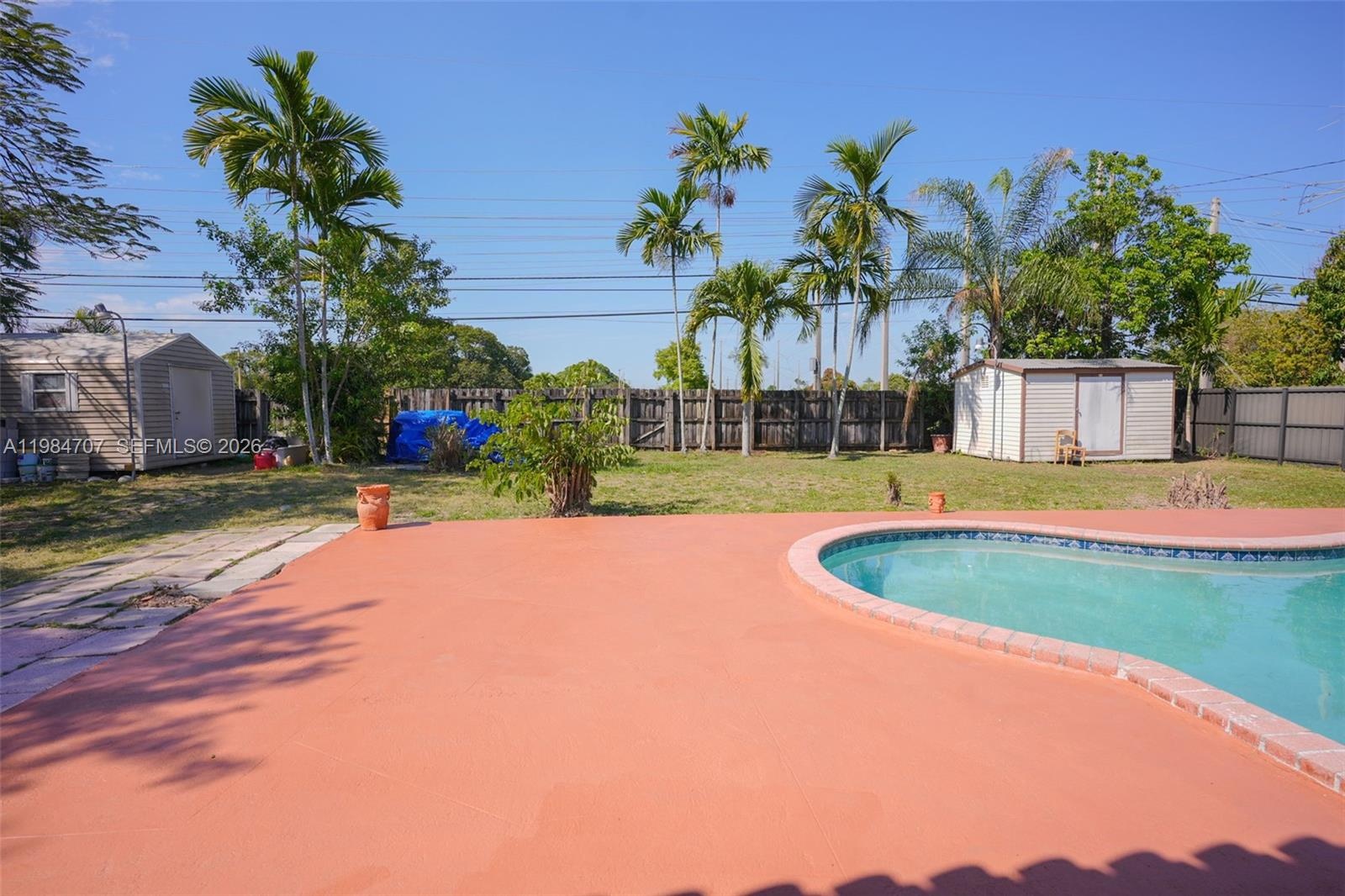 1,326 sq ft of living area, 920 sq ft concrete patio, Beautiful swimming pool, Two storage sheds: Shed #1 (200 sq ft) and Shed #2 (110 sq ft), Large electricity generator with installed gas tank, Pool equipment, Full laundry room, Additional storage room. The front of the property includes a spacious driveway with ample parking. On both sides of the home, there are two large metal gates providing convenient access for boat storage.