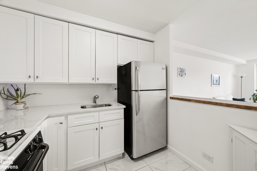 A large, gracious entry foyer provides sufficient enough space to enjoy a home office desk set-up leads into a well-proportioned living and dining area, offering excellent flexibility. The expansive living room showcases three oversized windows and a glass door opening to a private terrace with picturesque views of Stuyvesant Square Park, the historic red brick Quaker meeting house, Friends Seminary, the clock tower of St. George's Episcopal Church, and the iconic Empire State Building.