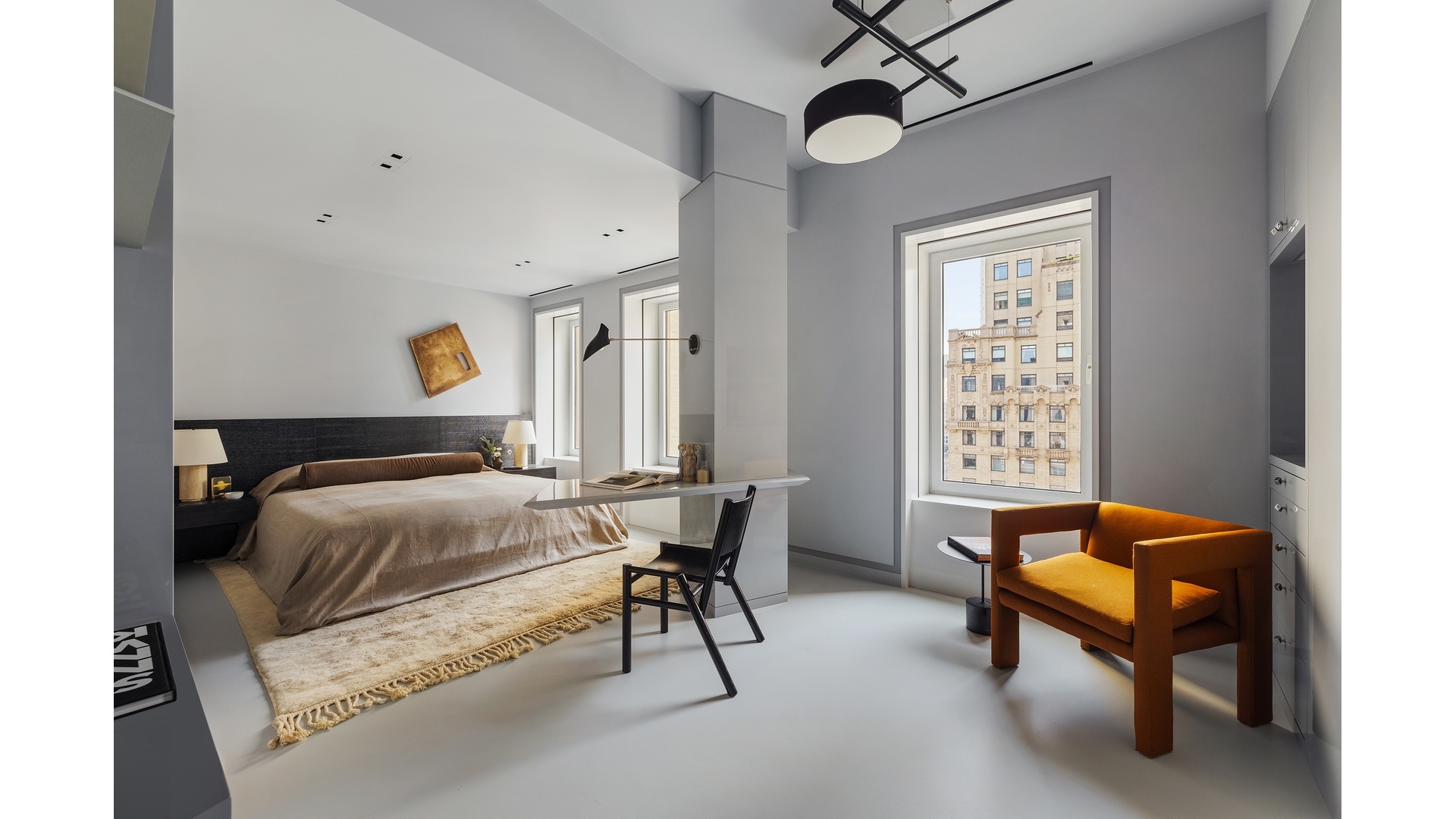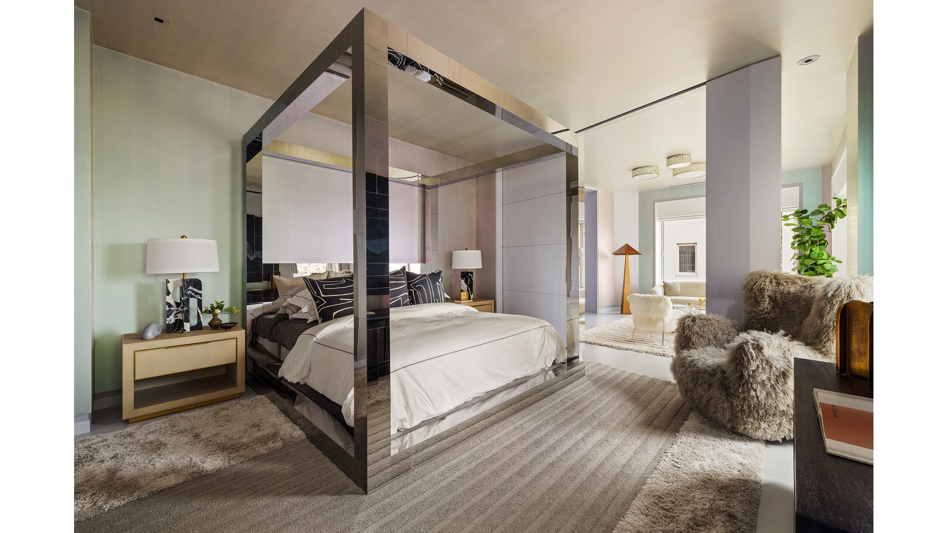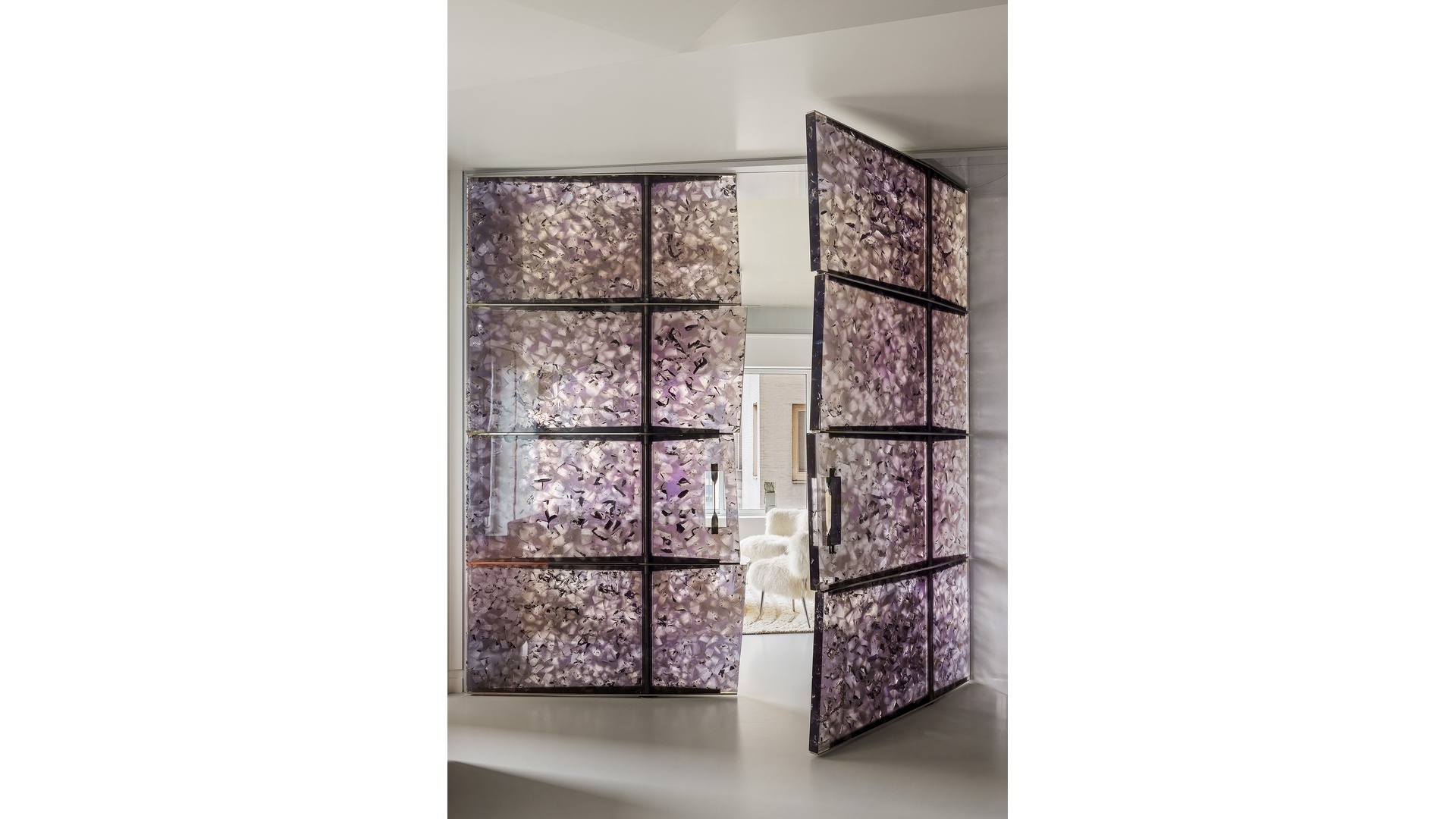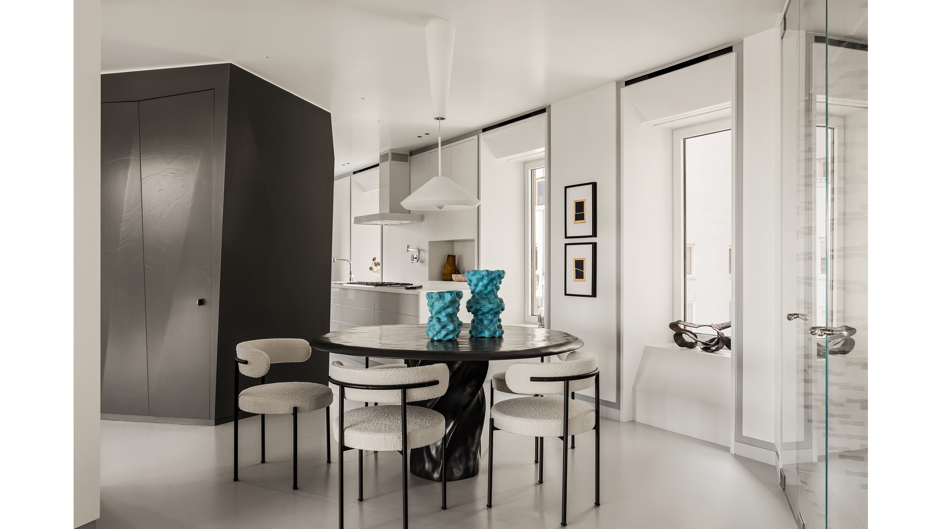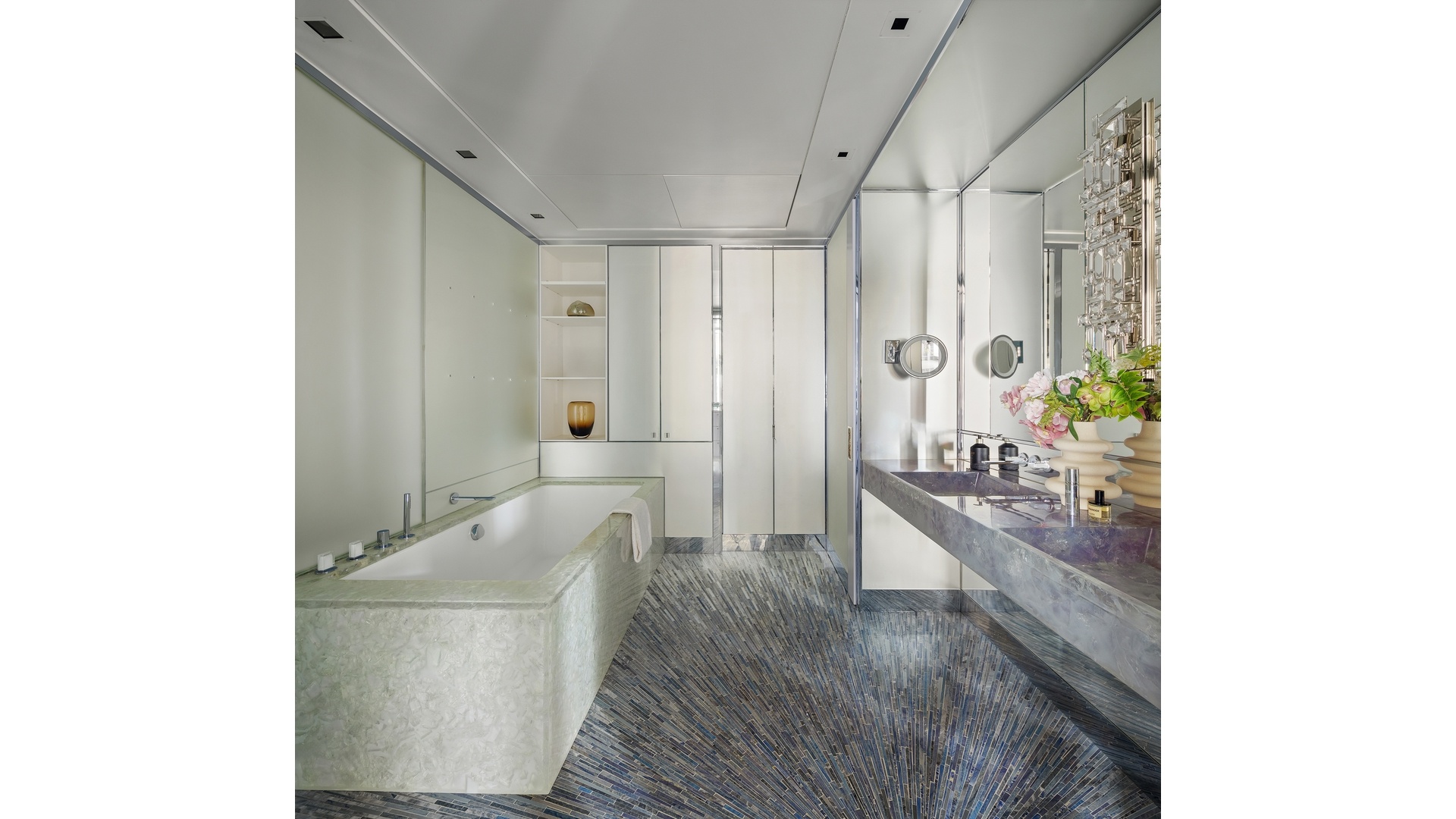 Throughout the residence, polished urethane flooring provides a seamless, semi-reflective surface reminiscent of the world's finest contemporary art galleries. Hand-laid mosaic flooring adds craftsmanship, while sculptural lighting installations by Lindsey Adelman Studio illuminate the interiors. Atta Inc. created several of the apartment's most distinctive elements, including pivoting resin doors framing the primary suite and custom-designed bathroom vanities throughout.