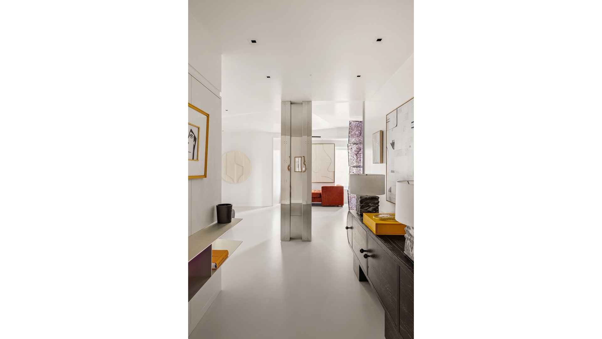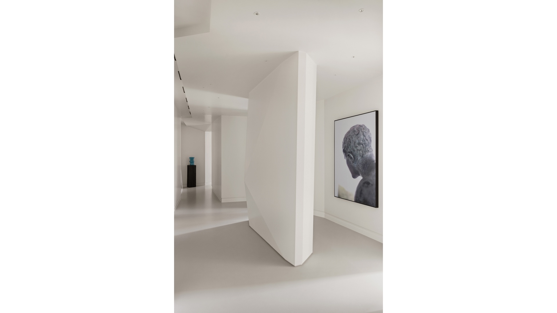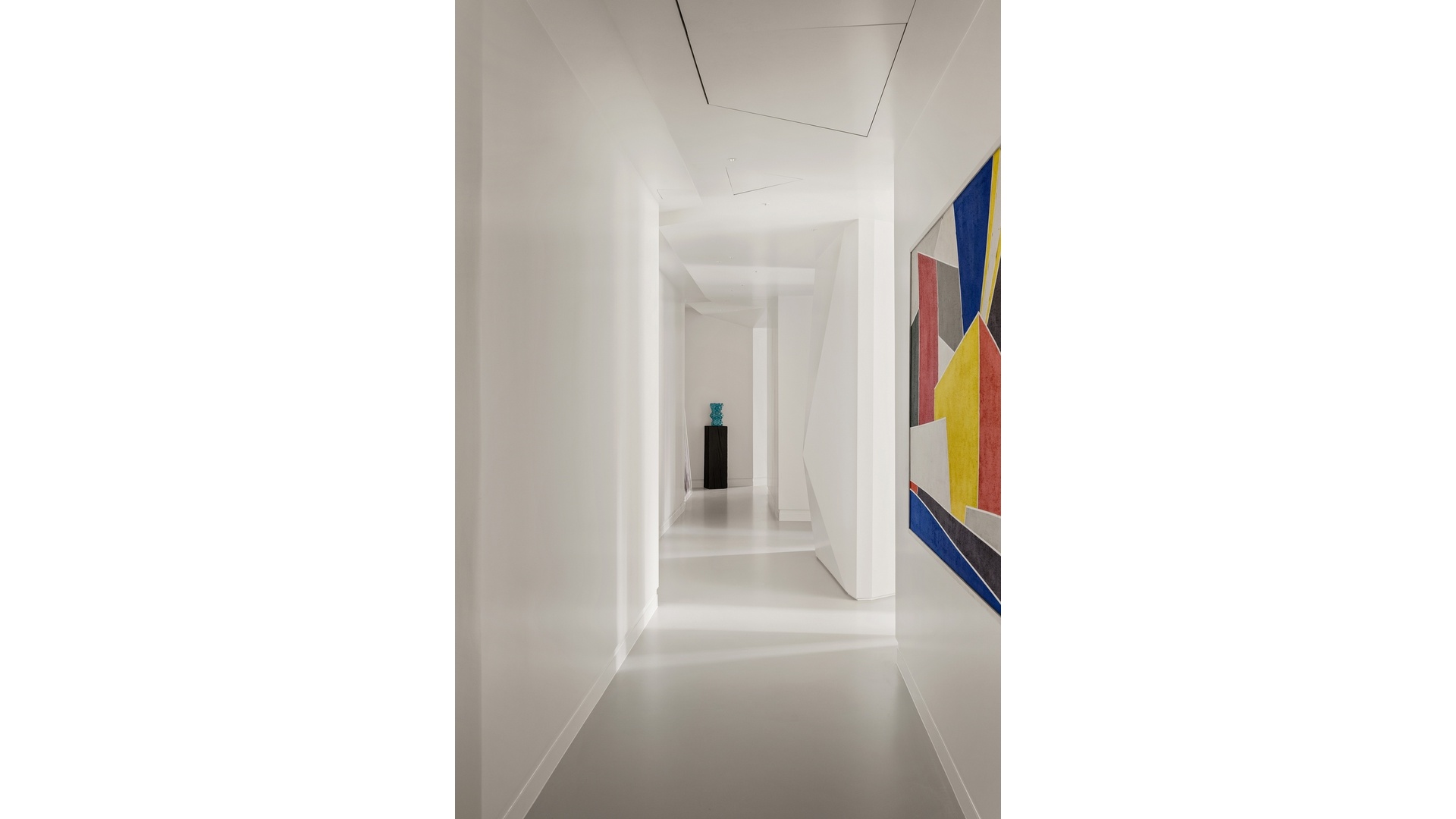 The interiors were conceived by the internationally renowned design firm D'Aquino Monaco and took several years to complete. Their vision celebrates independent artistic expression while maintaining a serene, refined atmosphere. Throughout the residence, architectural innovation meets gallery-quality finishes: floating and faceted walls and glass-clad structural columns create a dramatic, curated environment.