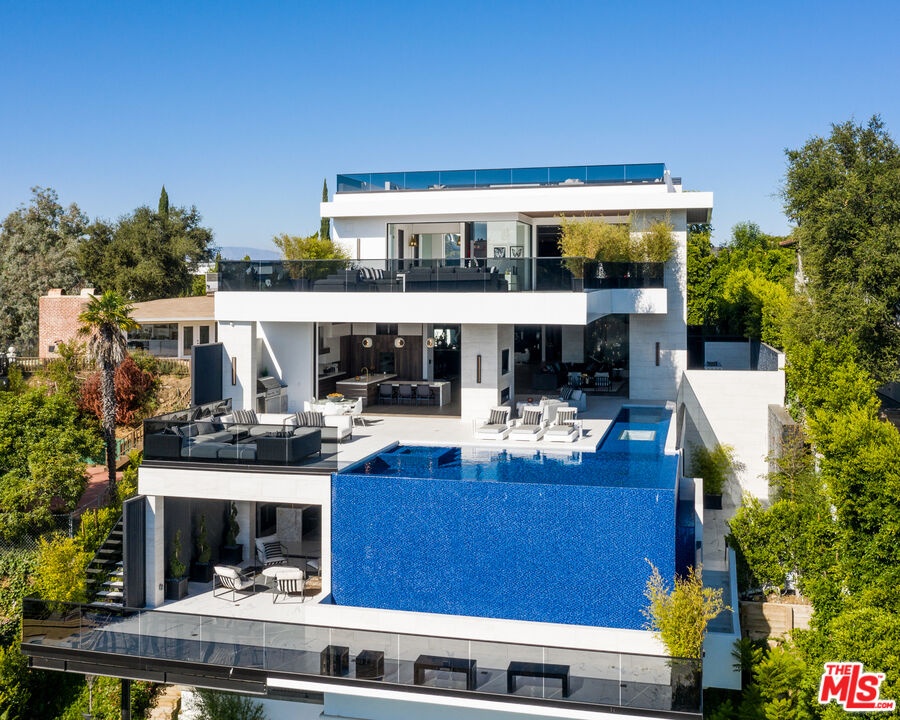 In one of Bel Air's most prestigious enclaves, this warm modern masterpiece by Ramtin Ray Nosrati captures sweeping vistas that span city lights, ocean horizons, and canyon ridgelines. A grand, light-filled floor plan unfolds with bespoke flooring, sculptural lighting, and expansive Fleetwood walls of glass that recede to create a seamless dialogue between indoors and out. The gourmet kitchen is a study in quiet refinement, wrapped in rich wood and marble, and appointed with top-tier appliances, dual ovens, wine refrigeration, and an oversized island with breakfast bar. Just beyond, a striking glass-bottom infinity pool spills gracefully into a lower-level waterfall, an intentional moment that anchors the home with serenity and visual intrigue. Five-star amenities include a sumptuous primary suite with private terrace, beautifully appointed guest accommodations, a dual-sided tropical fish aquarium, indoor waterfall, formal dining room, and multiple fireplaces that lend warmth throughout. Gated grounds and lush, layered landscaping frame a series of outdoor living spaces designed for both privacy and repose. Created with the consummate entertainer in mind, the lower level reveals a suite of extraordinary amenities, including a luminous onyx bar, a state-of-the-art theater with fiber-optic star ceiling, an immersive video wall, fitness studio, and a temperature-controlled wine cellar. A rare architectural work of art set within one of Bel Air's most coveted addresses.
