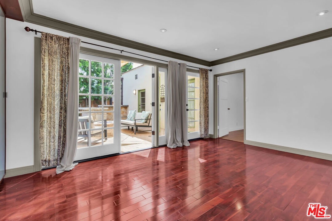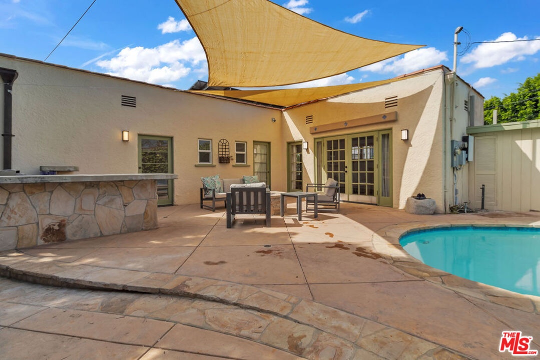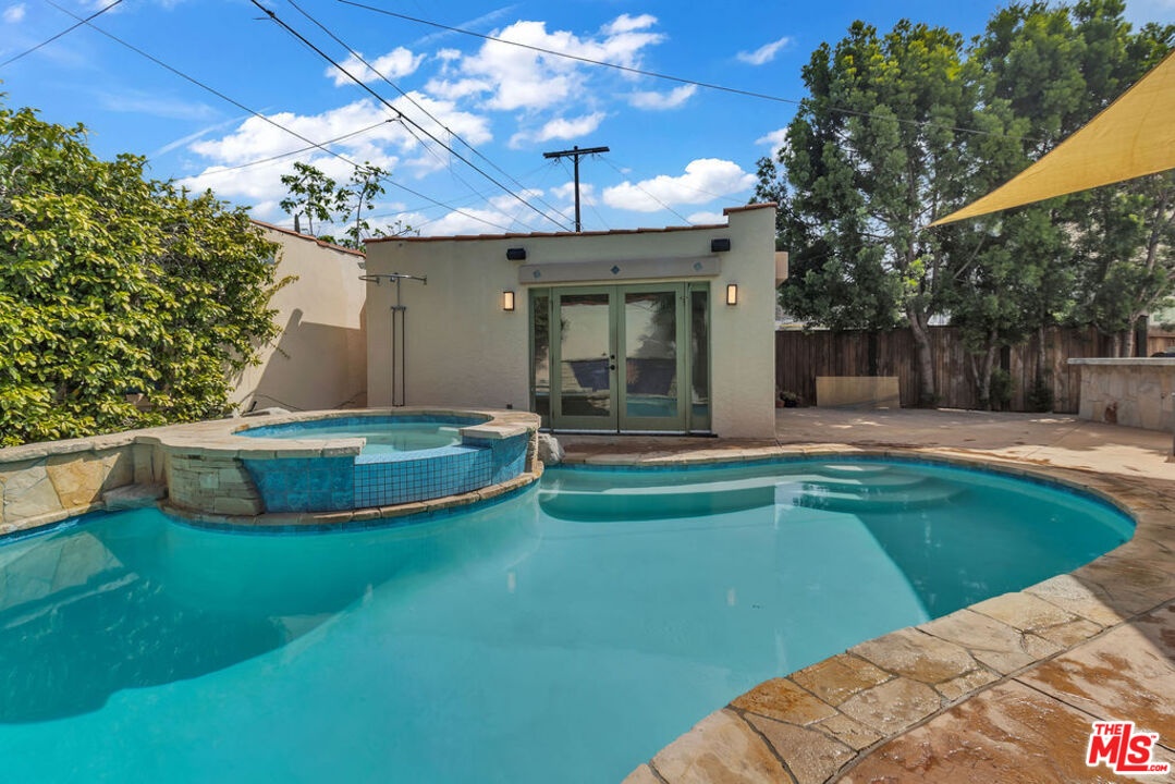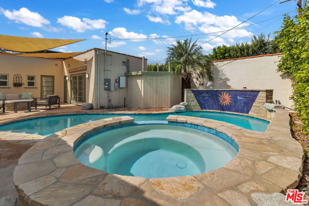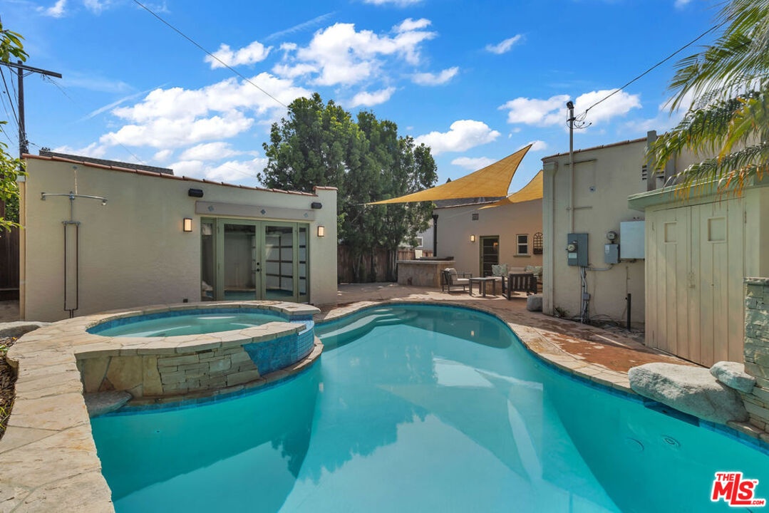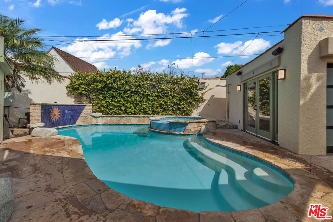 REMODELED CHARACTER SPANISH WITH POOL, SPA AND BONUS ROOM/FOURTH BEDROOM IN BEVERLY GROVE. Ideally located on one of the nicest streets in this highly sought after neighborhood, enter this beautiful home through a front patio into a grand living room with barrel ceiling, picture window and decorative fireplace. A formal dining room adjoins an open, redesigned kitchen with stainless steel appliances, separate breakfast room, skylight, and side entrance. There are three generous bedrooms as well as a large bonus room through the primary bedroom that could serve as a fourth bedroom featuring French doors leading to a private backyard with a large, heated pool, spa and a nicely finished garage/flexible space. Additional features include central AC, remodeled main bath with soaking tub and shower, recessed lighting, gated driveway, and period details throughout including inlaid floors, stenciled walls, full size front loading washer and dryer, firepit and outdoor kitchen.