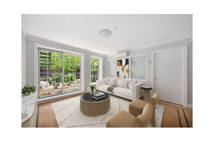 This exceptional 2-bedroom, 2-bathroom duplex offers an abundance of space and natural light in one of Greenpoint's most coveted locations. The expansive "Great Room" features a decorative fireplace, floor-to-ceiling windows, and high ceilings that create a bright and airy atmosphere. Glass doors open directly to a private garden, seamlessly blending indoor and outdoor living. The maple hardwood floors add warmth and sophistication throughout. The chef's kitchen is a true highlight, complete with custom cherry cabinetry, granite countertops, and stainless steel appliances, perfect for both casual meals and entertaining. The master bedroom, located on the first floor, is generously sized and includes a luxurious en-suite master bath with a Jacuzzi tub and marble countertops. The lower level offers a versatile layout, featuring a massive den or second bedroom, a second full bath, and a wine cellar that can easily double as a small office. Additionally, there is a large walk-in closet for ample storage and access to another private garden. Photos have been virtually staged.