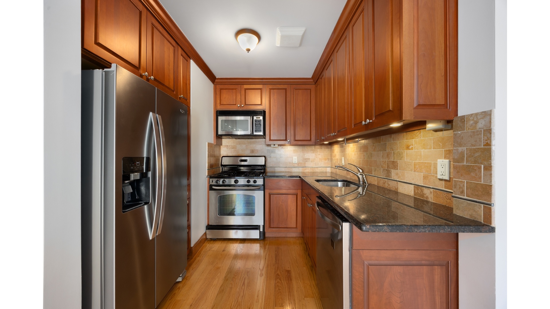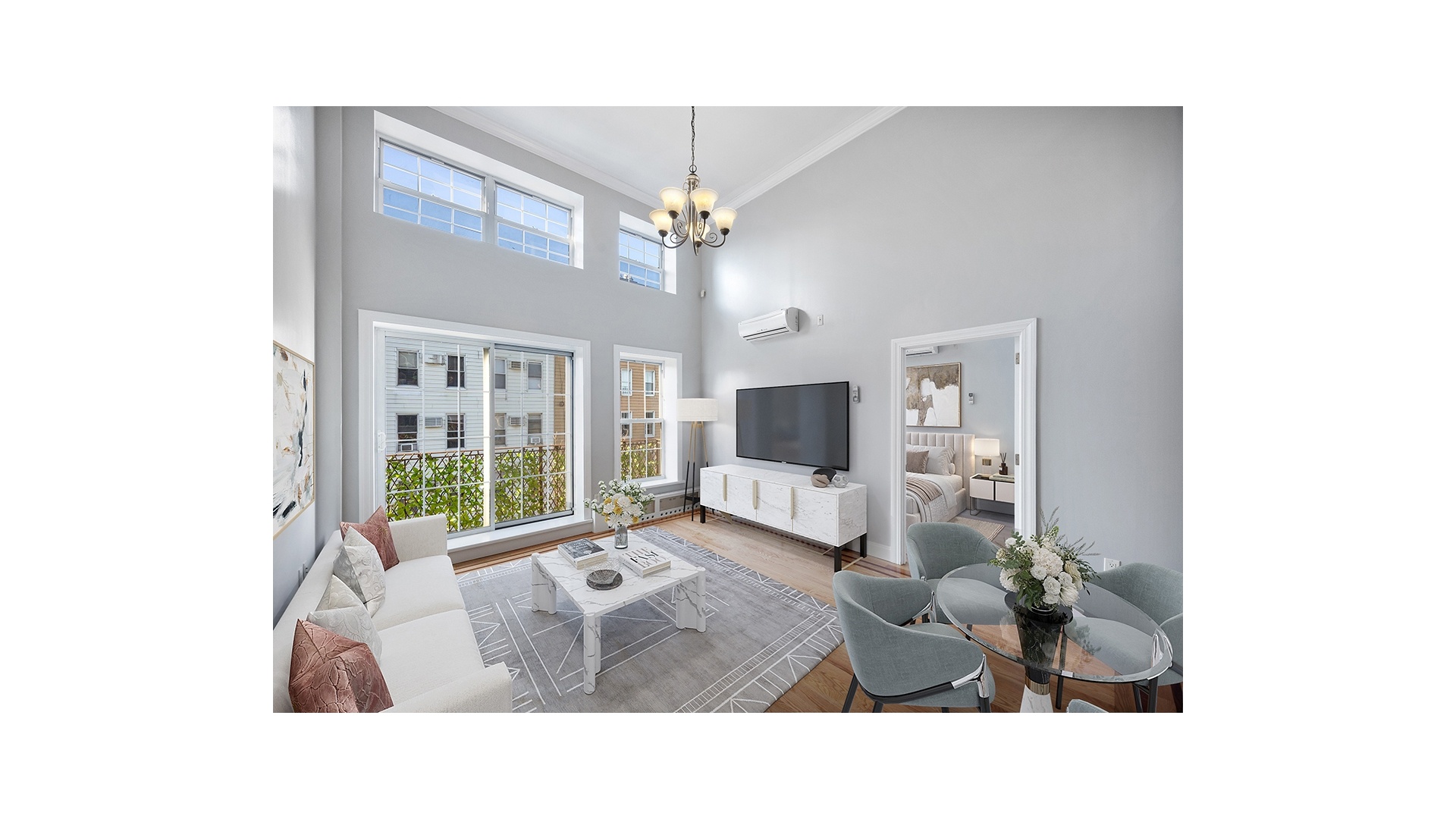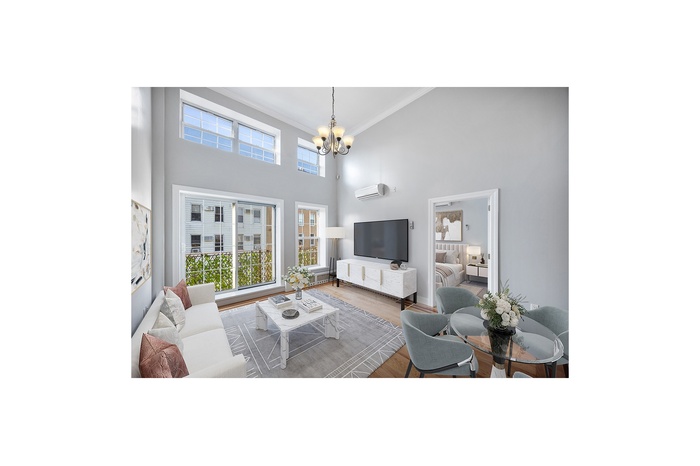 This spacious and thoughtfully designed 2-bedroom, 1-bathroom apartment seamlessly combines modern amenities with distinctive architectural charm. The living room and bedroom feature soaring ceilings that reach nearly 20 feet, creating a bright and airy atmosphere. The well-equipped kitchen is fitted with sleek stainless-steel appliances, elegant cherry cabinetry, and luxurious granite countertops. The bathroom is equally impressive, showcasing imported marble tiles, double vanity sinks, and a deep-soak Jacuzzi tub-perfect for unwinding after a long day. Convenience is key with an in-unit washer/dryer, and the loft space provides added flexibility-ideal for an extra bedroom, home office, or additional storage. With a ceiling height of around 5 feet, the loft offers character and extra functional space without compromising on the apartment's overall comfort. The apartment features genuine oak floors throughout and crown molding details that add an extra touch of sophistication. A highlight of the space is the stunning cathedral-like loft ceiling that adds volume and light to the unit, setting it apart from more typical apartments in the area. The apartment also boasts a charming French balcony off the living room, providing a cozy spot to enjoy the outdoors. Photos have been virtually staged.