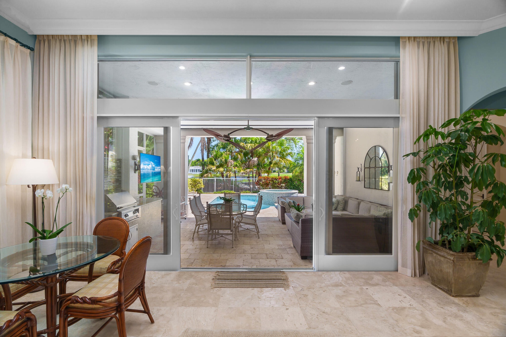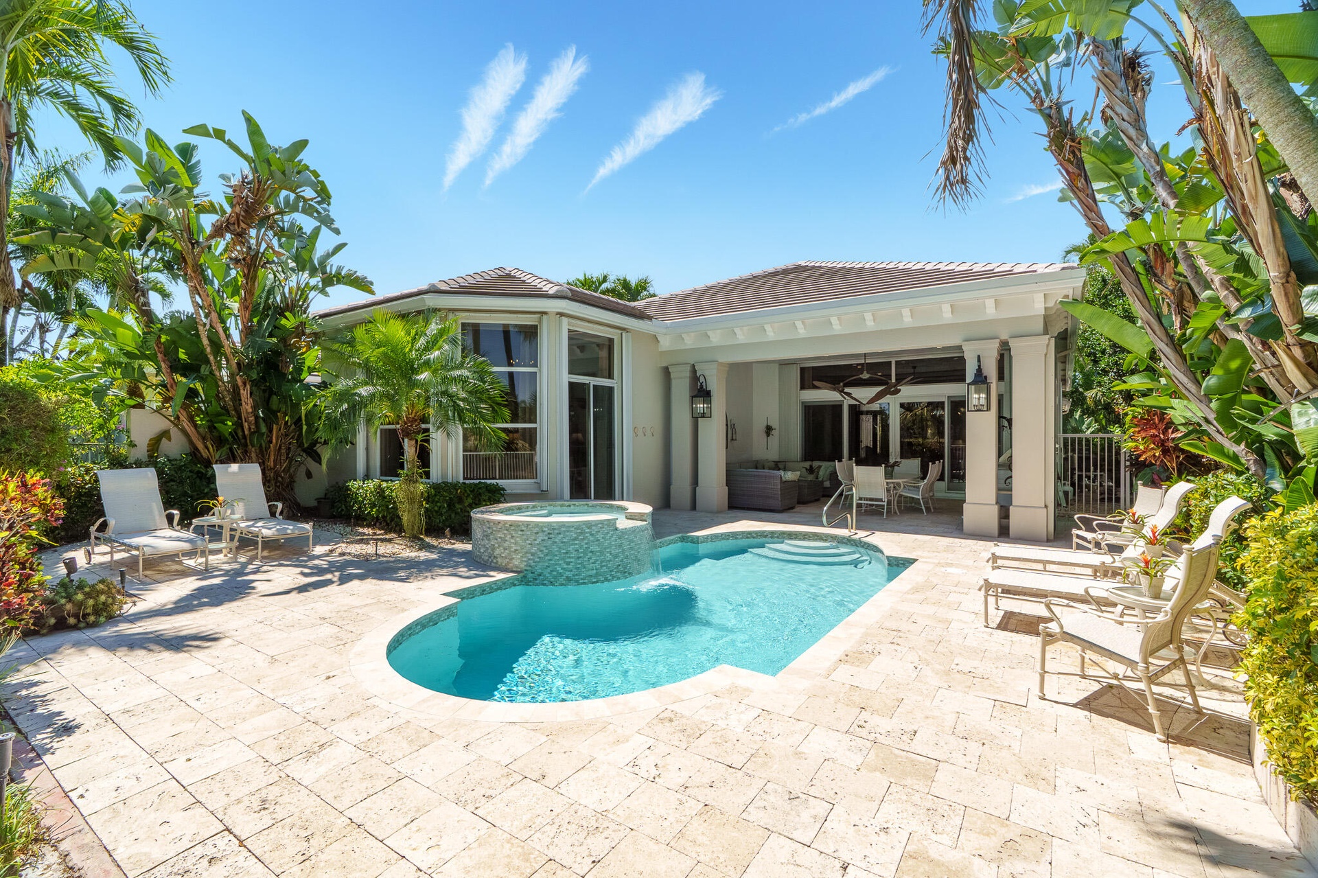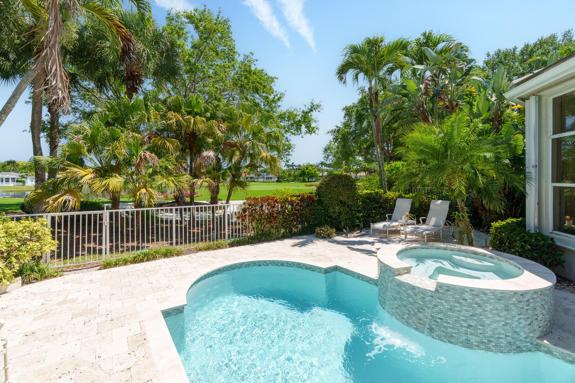 Incredible 4 bedroom, 4 full bathroom home with direct golf course and lake views. New flat tile roof and Screened Gutters (2024), Newly renovated resort like heated pool, spa, and patio (2025), New pool heater (2021), New SONOS system (2021), New Covered Lanai Remote Controlled Screening System, ( 2023), New A/C units (2022 and 2025), Newly renovated kitchen complete with Wolf, Viking and Miele appliances, Wine refrigerator, Newly renovated bathrooms, New Complete Home Hurricane Shutter System (2020), and so much more. This light, bright, spacious home has a South facing backyard, and the outdoor area is complete with a TV, built in BBQ, couch/sitting area and is the epitome of indoor/outdoor sunny Florida living. Virtually staged photos of parts of the home. Some photos are virtually staged.