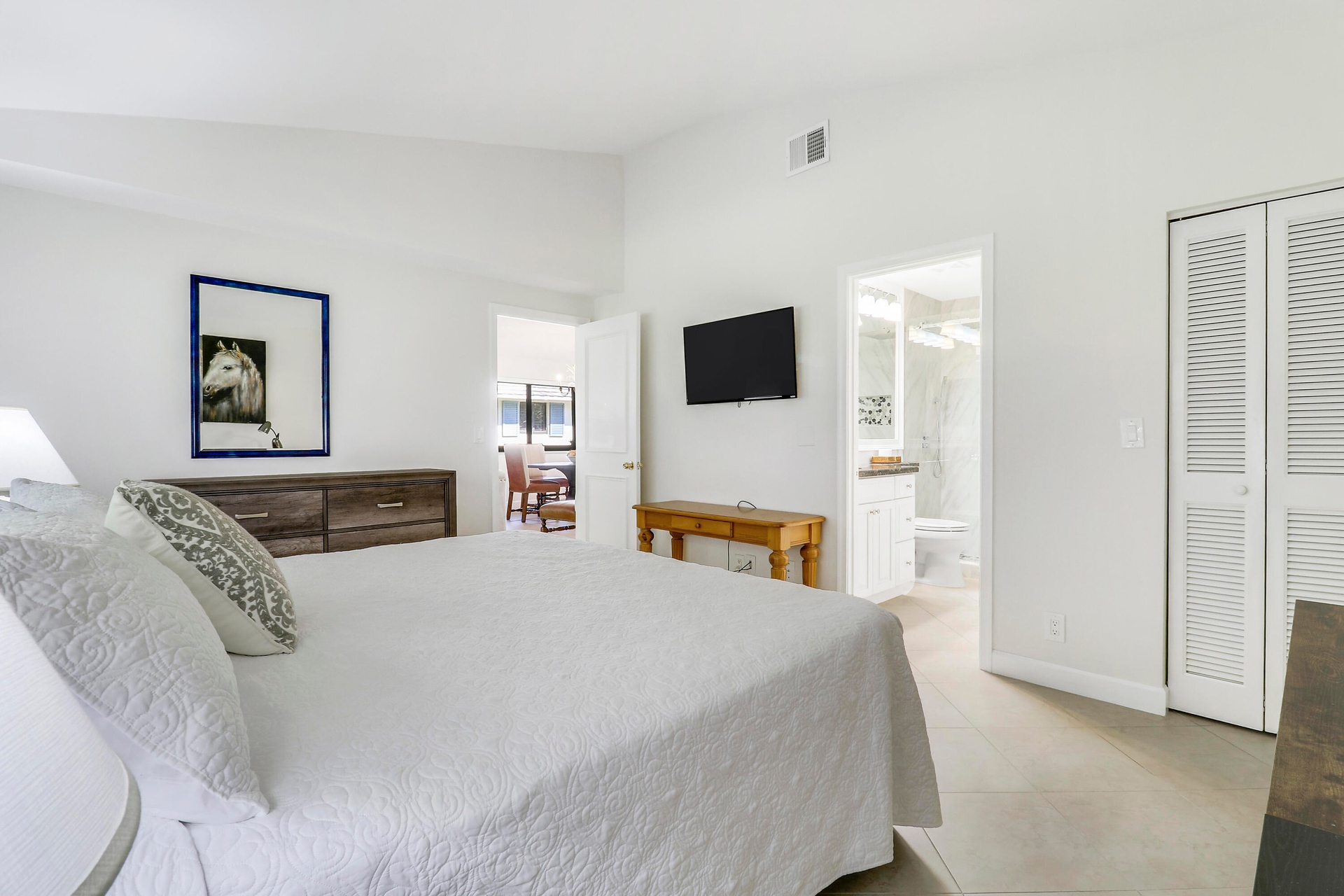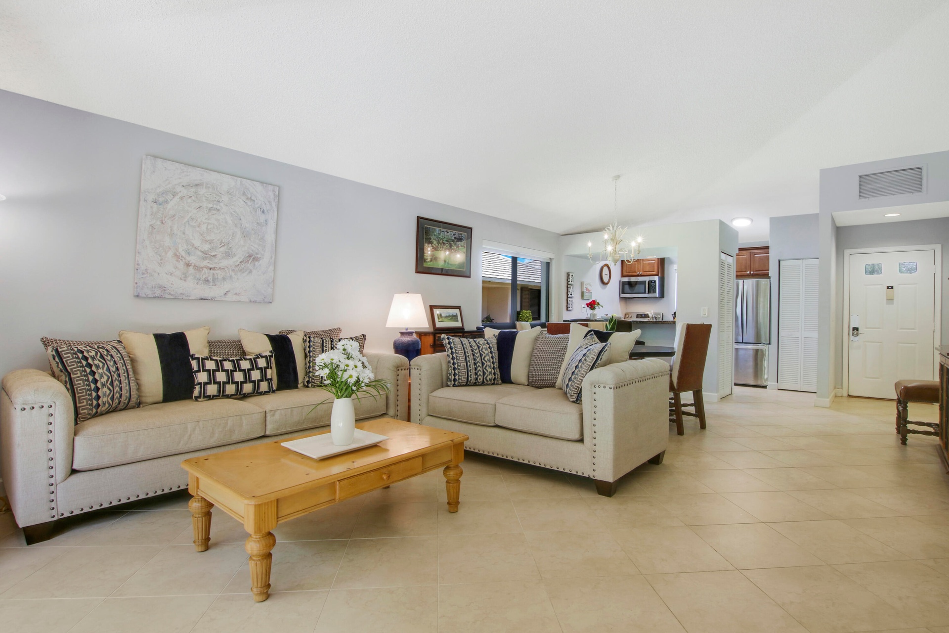 All the comforts of a single family home. In a private, turnkey two bedroom cottage. On Squire Square in between the Staple and the Match courses in PGA National's Club Cottages. Renovated with two walk-in showers. New King bed in primary bedroom. Two Queen beds in guestroom. Private front and back patios. Washer/Dryer, Tiled floors throughout. Soaring ceilings. Wifi and Basic cable included. Manned guard gate and security patrols. Walk to the PGA Resort, Restaurants and Spa. The Mirasol Publix shopping center is right across from the PGA National entrance. A Preferred Cottage often rented for six months and a day; no taxes collected! Twenty minutes to PBI airport and Palm Beach Island. Miles of walking paths that begin at your front door. Experience living in PGA Paradise today.