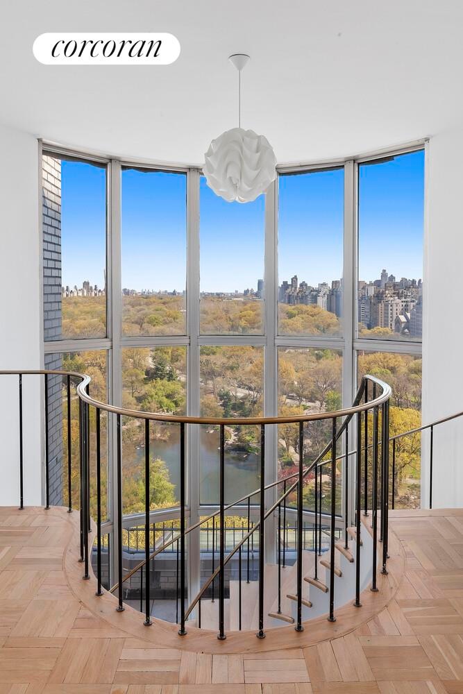 Proceeding towards the upper level, a two-story, glass-enclosed circular staircase facing Central Park is a unique and breathtaking feature of the penthouse. Beautifully designed, it floods the apartment with natural light. Heading up the curved staircase, one arrives on a sunny landing with expansive park views, with a walk-in closet on each side. Custom curved doors open to the primary suite, allowing for symmetry facing the staircase and the park beyond. The primary suite also features sunny southern exposures, and an ensuite bath with a soaking tub.