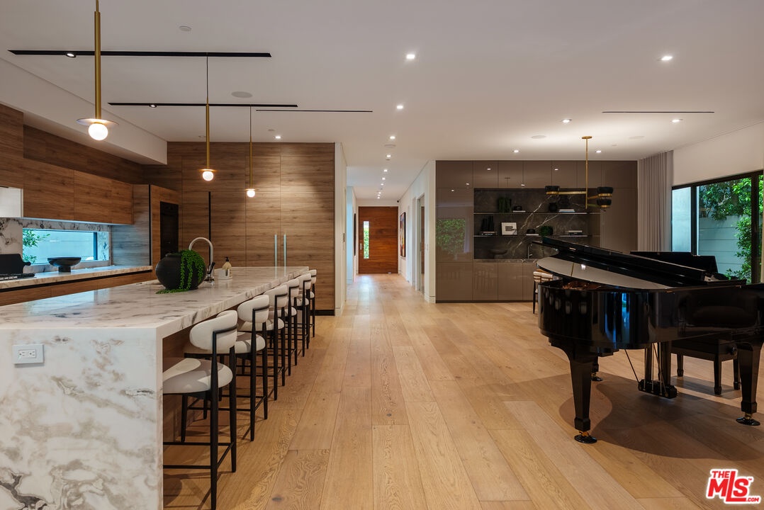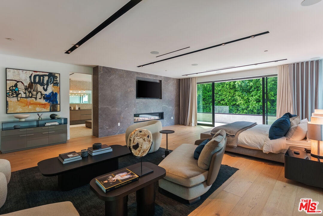 A standout offering in one of LA's most coveted neighborhoods, this exceptional residence showcases elevated craftsmanship, striking architectural detail, and an expansive rooftop retreat with sweeping 360-degree city views. Designed to rival the area's finest new builds, the home opens with a dramatic walnut pivot entry into a light-filled floor plan tailored for seamless indoor-outdoor living. The main level is thoughtfully curated for both everyday living and entertaining, featuring a wine room, a bonus room (theater/exercise/recording studio), formal dining space with wet bar, and a custom Italian kitchen outfitted with premium finishes. Designer stone and tile, European oak floors, Fleetwood walls of glass, and multiple fireplaces all frame views of the illuminated pool, creating a true resort-style ambiance. A sculptural floating staircase leads to four generous en-suite bedrooms, including a sophisticated primary suite with a lounge area, dual custom LED-lit walk-in closets, a private terrace, and a striking stone fireplace. Additional highlights include a gated circular motor court, advanced smart home integration with top-tier media and security systems, and dual-zone climate control. The rooftop level, complete with its own powder room, is designed for elevated entertaining against a panoramic city backdrop. Originally designed by internationally acclaimed Chimera Interiors and set on a celebrity-favored block, this home offers a rare blend of privacy, scale, and design in the heart of Beverly Grove.