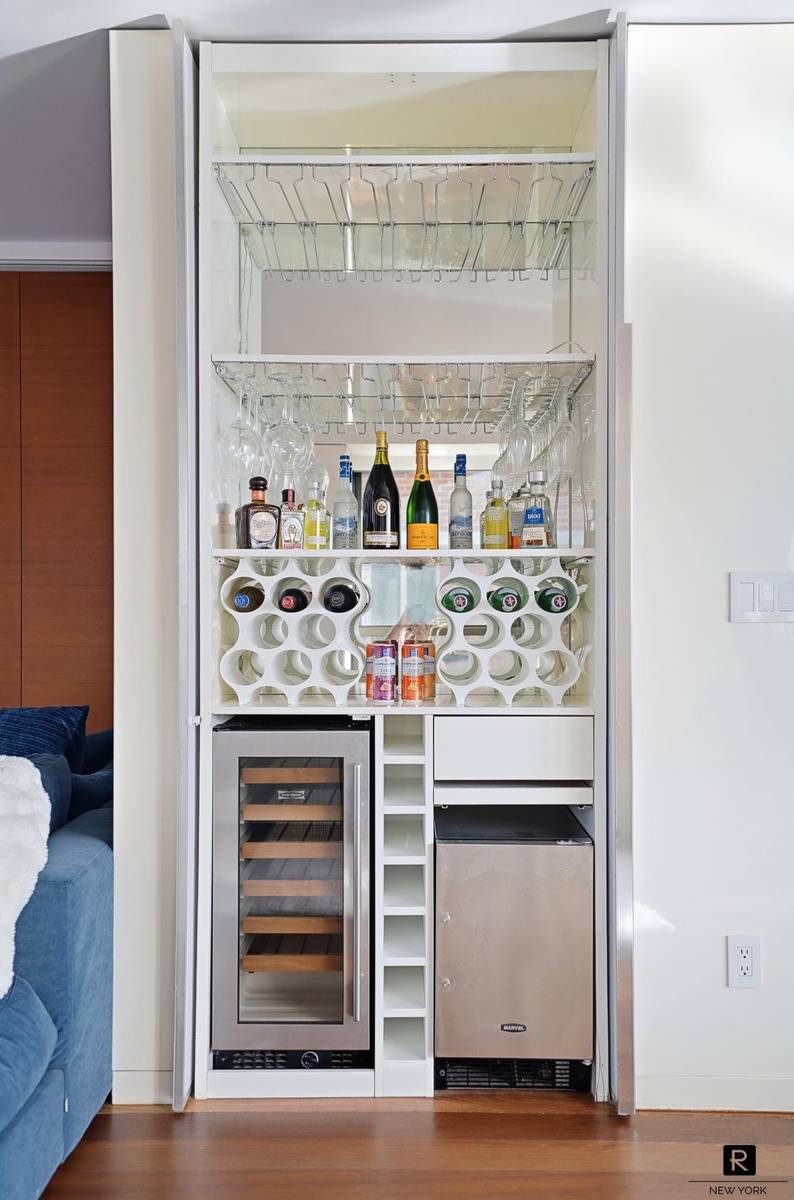 The chef’s kitchen features white lacquer cabinetry, stone countertops, and premium Miele and Sub-Zero appliances, including an induction cooktop with downdraft, convection oven, and built-in coffee station, perfectly balancing form and function. Solid Brazilian Cherry floors run throughout, complemented by custom teak and lacquer millwork, integrated lighting, and hidden storage solutions that maintain a refined, uncluttered aesthetic.