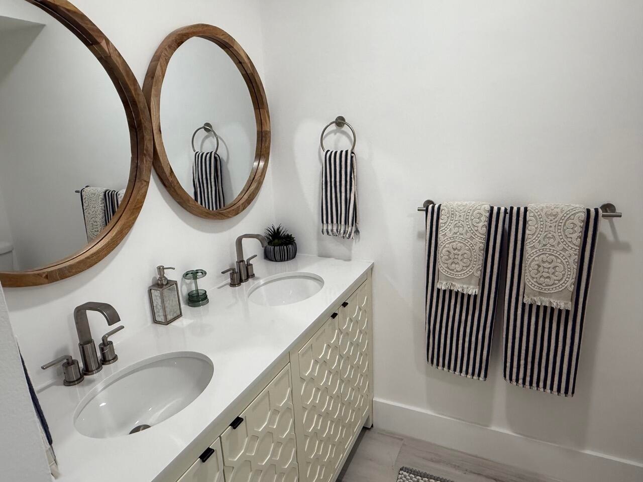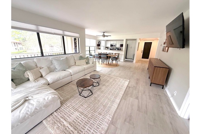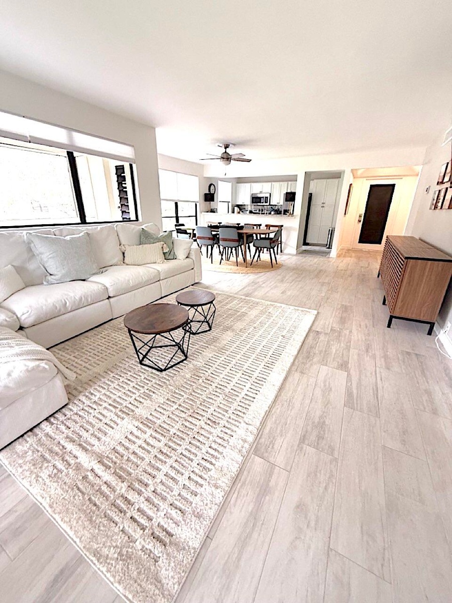 Available for seasonal or annual rental. Private Entrance.Just been re-furnished. All new light grey porcelain plank tile throughout. Guest and master bathrooms have been renovated, new toilets, vanities, mirrors,,lighting, tile work and glass seamless shower doors. TV's have been wall mounted and all new ceiling fans installed. Outside wraparound balcony floor has been tiles as well.