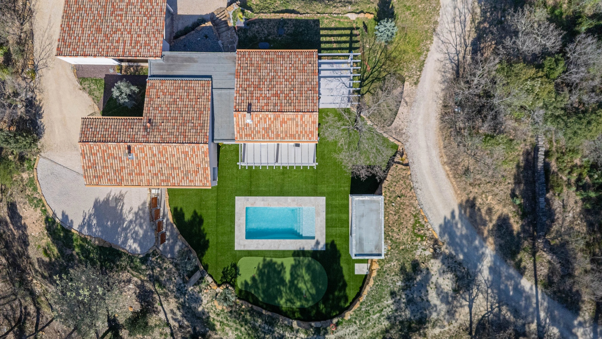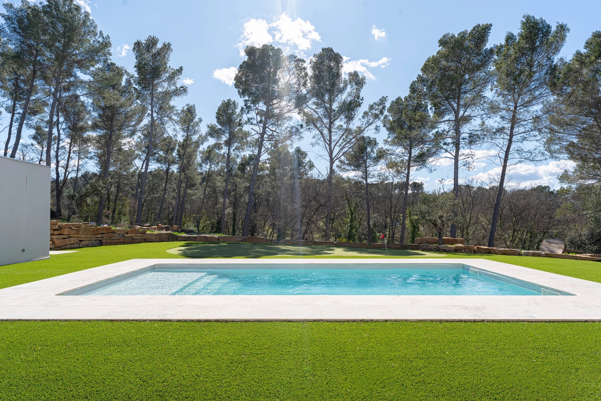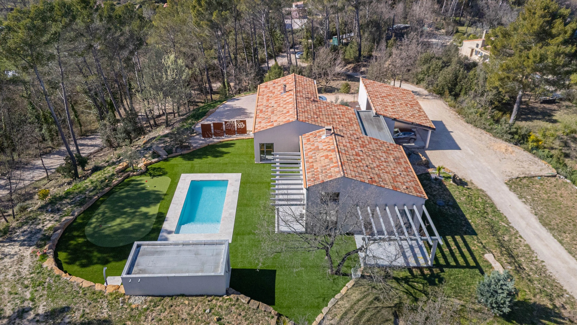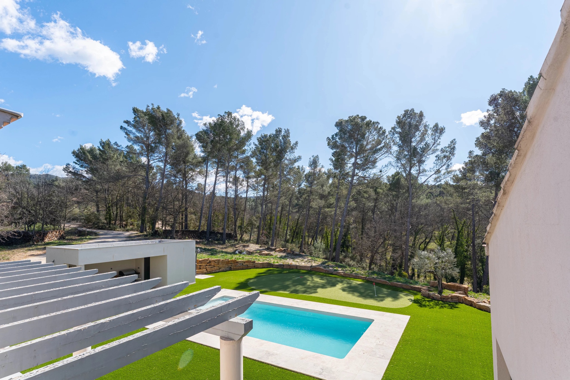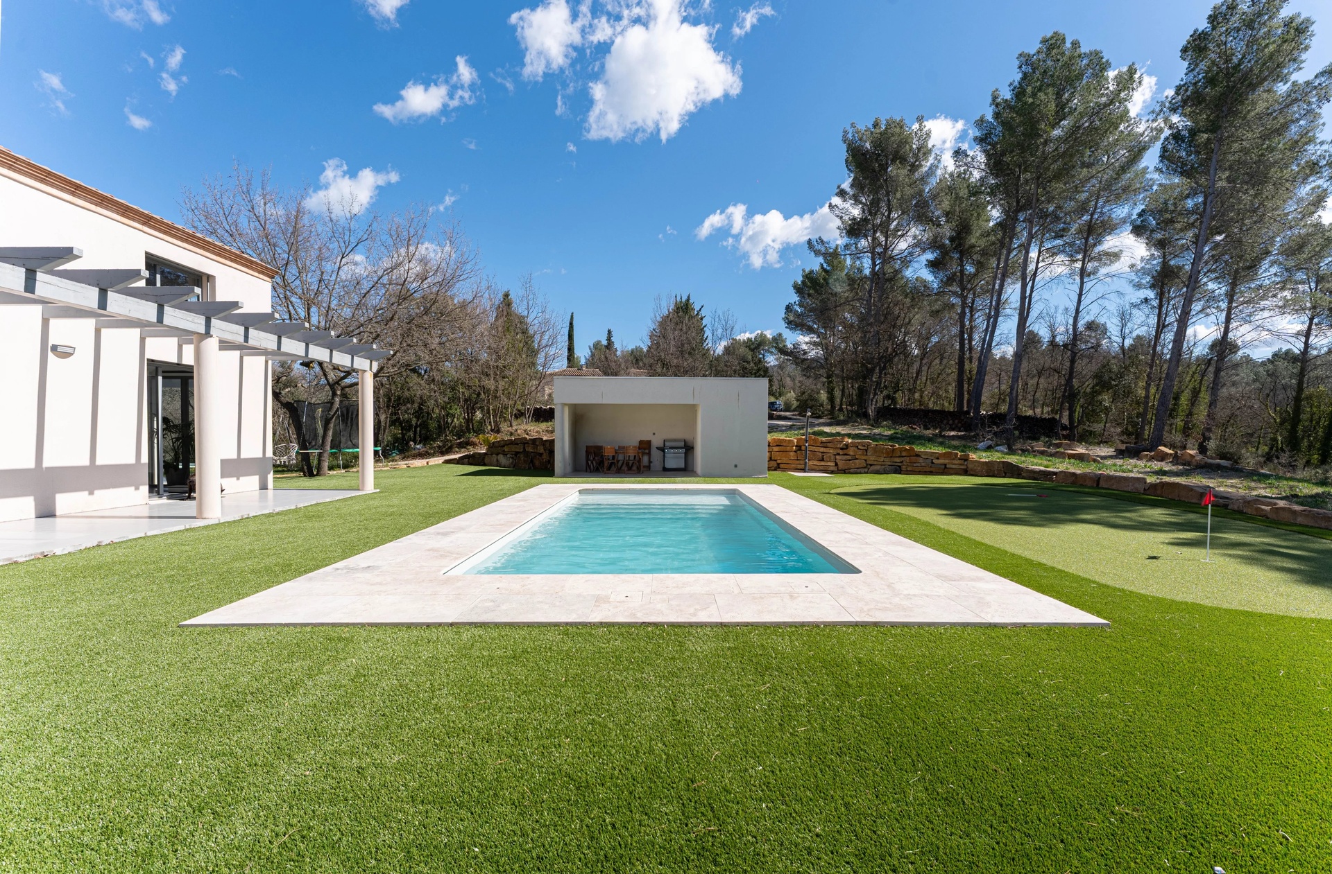The exterior spaces have been thoughtfully designed as an invitation to relaxation: • two terraces with complementary exposures • a saltwater swimming pool with pool house • a putting green for golf enthusiasts