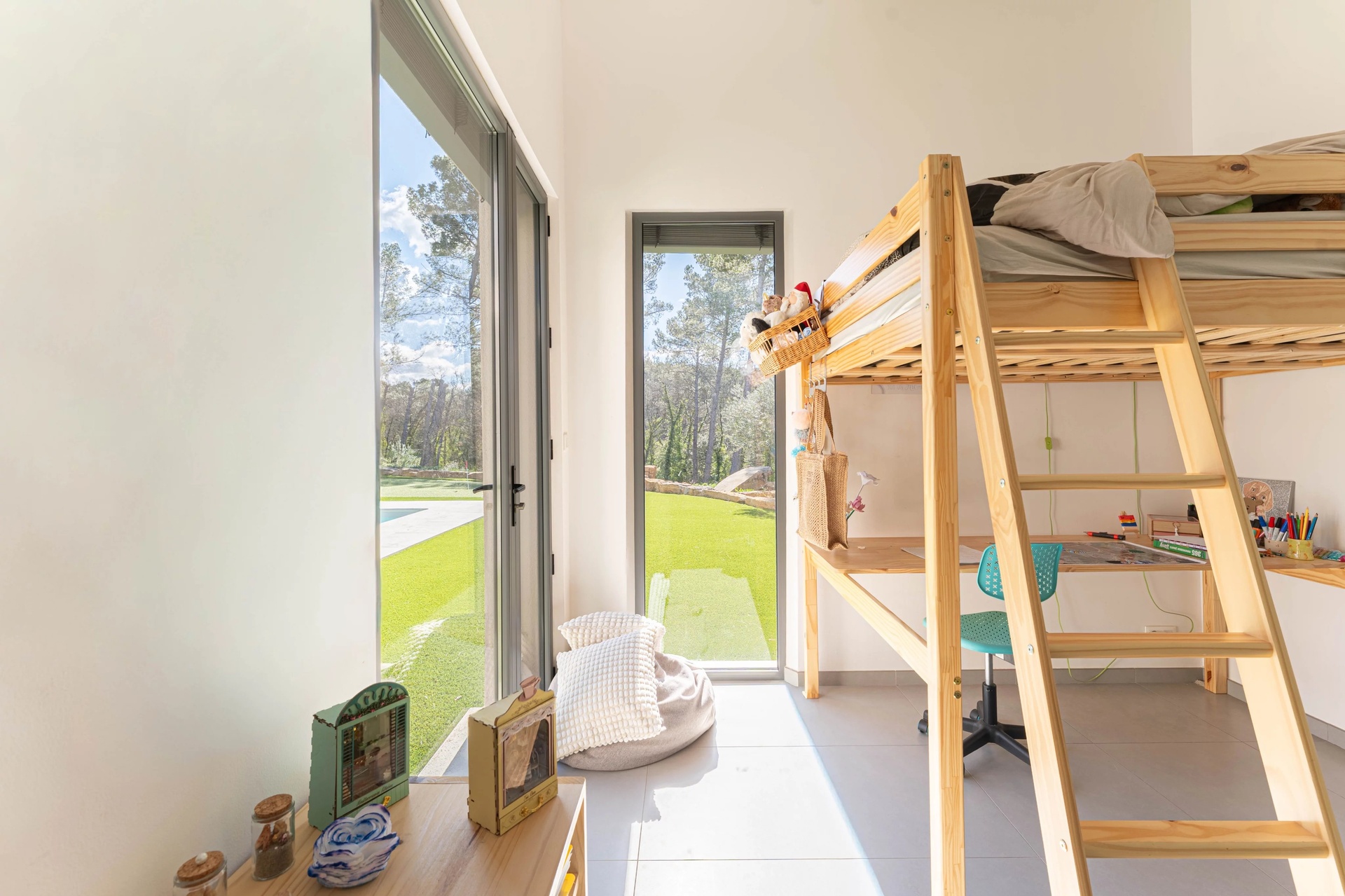 Designed for both comfort and functionality, the villa offers on the ground floor a sleeping area comprising three bedrooms, a bathroom with WC, a shower room with WC, and a laundry room.